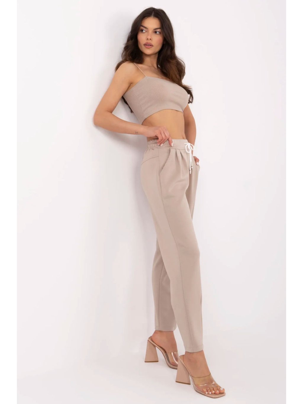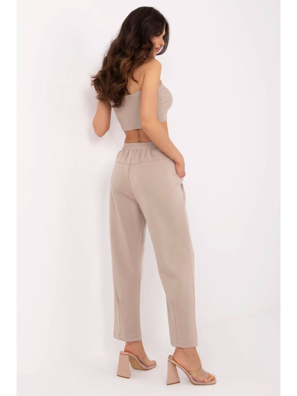 Tyto elegantní teplákové kalhoty v casual stylu jsou ideální kombinací pohodlí a elegance. Vyrobené z vysoce kvalitní směsi viskózy, elastanu a polyesteru, poskytují měkkost, prodyšnost a ideální přizpůsobení postavě. Vysoký pas a praktické šňůrkování v pase umožňují individuální přizpůsobení, zdůrazŠují pas a zajišťují pohodlí po celý den. Klasické, přímé nohavice dávají kalhotám univerzální charakter, díky čemuž se skvěle hodí jak do každodenních stylizací, tak do formálnějších kombinací do práce. Další výhodou jsou boční kapsy, které dodávají funkčnost a praktičnost. Hladký vzor a minimalistický design dělají z kalhot skvělou základnu pro mnoho outfitů, od casual po elegantní.