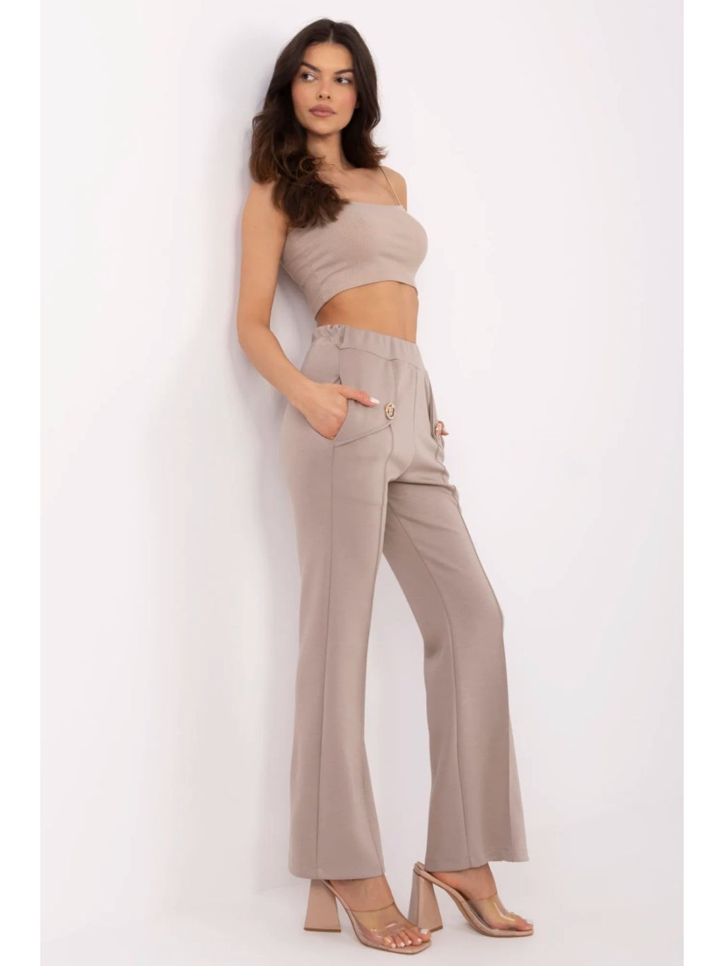 Tyto stylové tepláky kombinují pohodlí s moderním střihem zvonových nohavic, tvoří ideální řešení pro každodenní nošení i do práce. Vyrobené z vysoce kvalitní směsi viskózy, elastanu a polyesteru zajistí měkkost, pružnost a skvělé přizpůsobení postavě. Vysoký pas a elastický pás zaručují pohodlí a zdůrazňují pas, zatímco široké nohavice dodávají elegantní a prodlužující efekt postavě. Boční kapsy zvyšují funkčnost kalhot a dělají je praktickou volbou na každou příležitost. Hladký vzor a minimalistický design doplňují odnímatelné brože, které umožňují personalizaci stylizace. Tyto kalhoty jsou spojením moderního stylu a pohodlí, ideální pro ženy, které ocení eleganci v každodenním provedení.