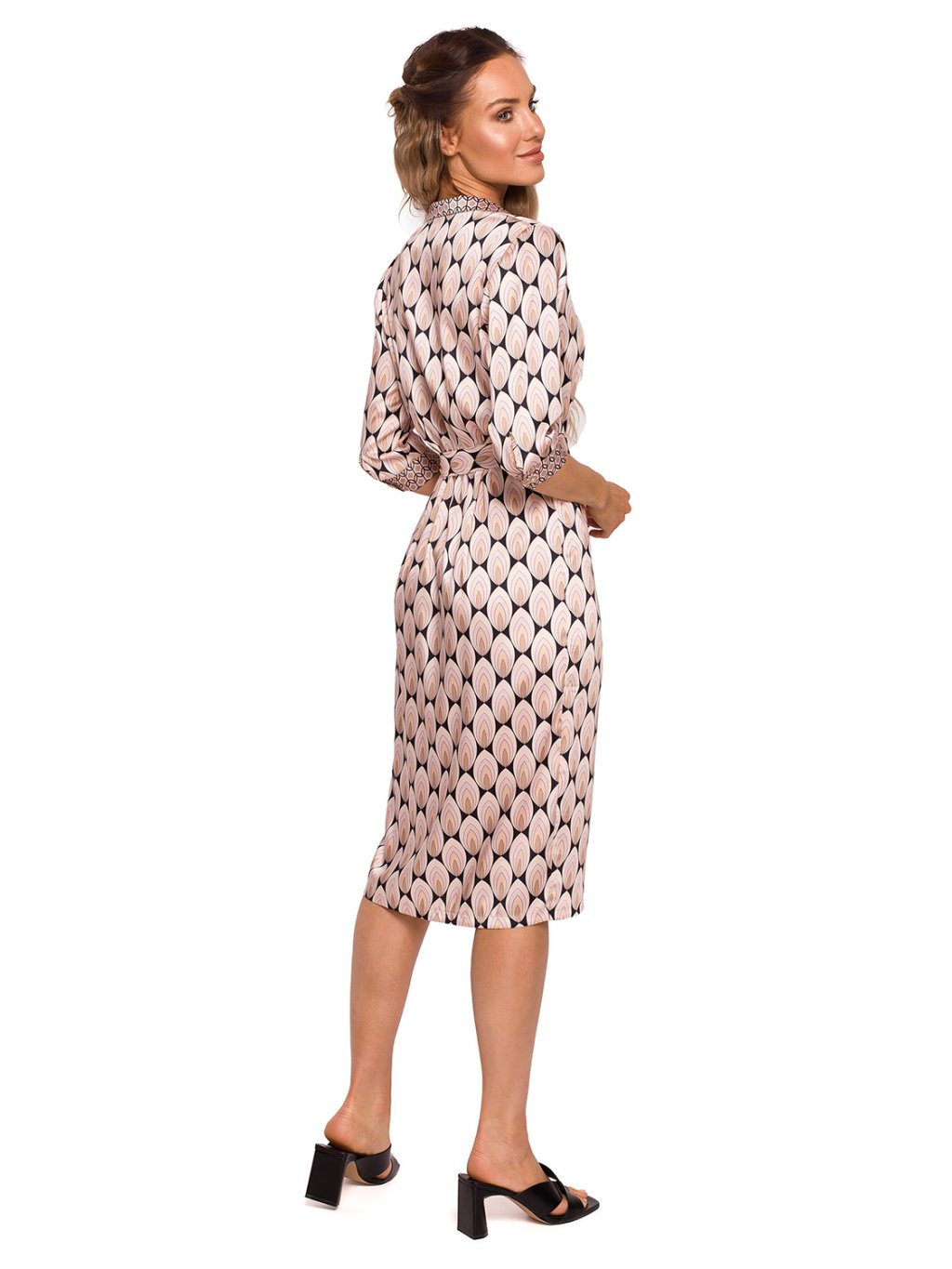 Ženské, pohodlné a nonšalantně zavázané páskem jsou tyto šaty z lehce lesklé látky s geometrickým potiskem jako stvořené pro dovolenou v tropech i procházku městem.