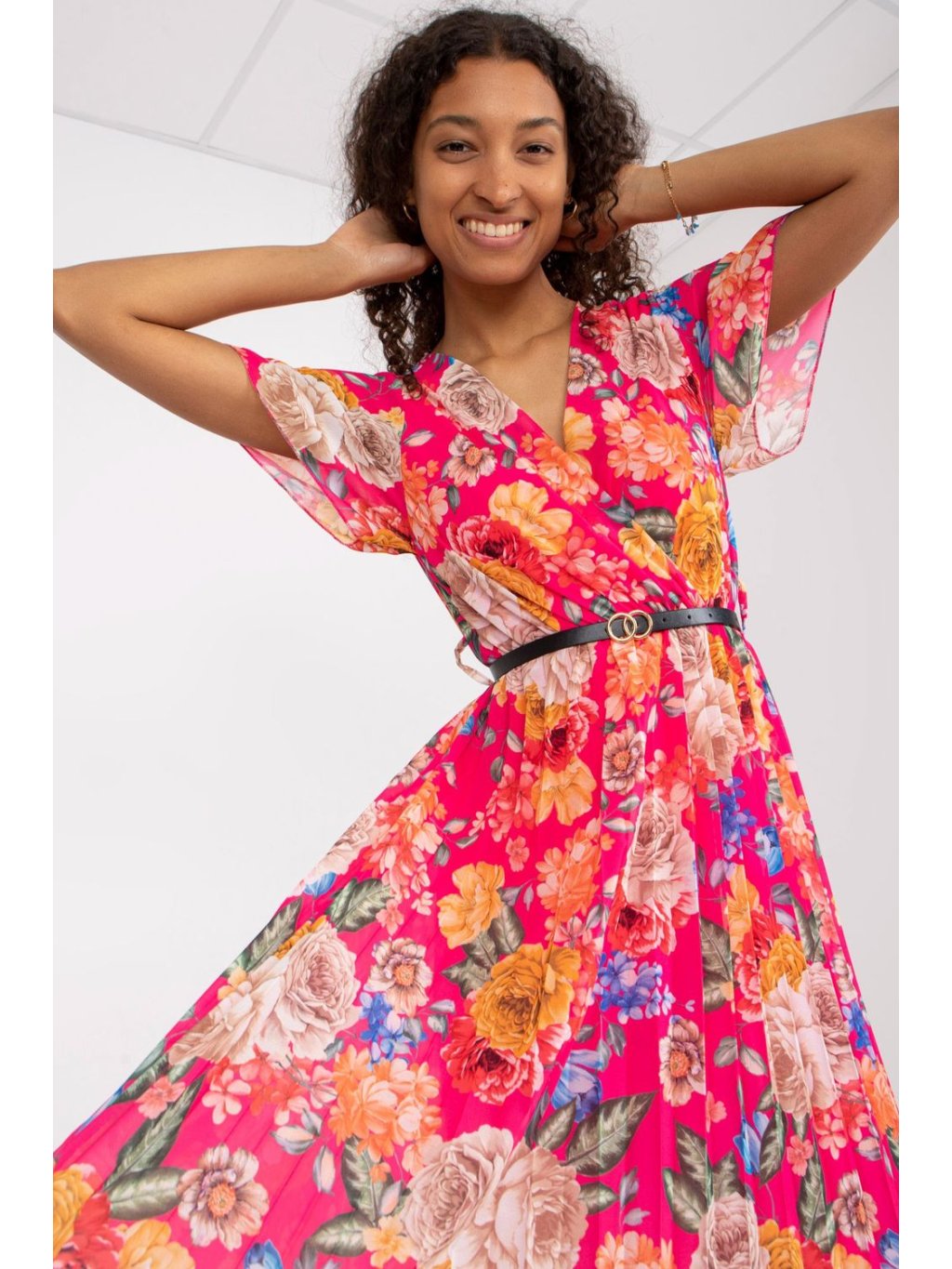Letní šaty z květované látky s rozšířeným střihem. Šaty s krátkými rukávy, obálkovým výstřihem a nařaseným lemem. Šaty mají podšívku a pásek.