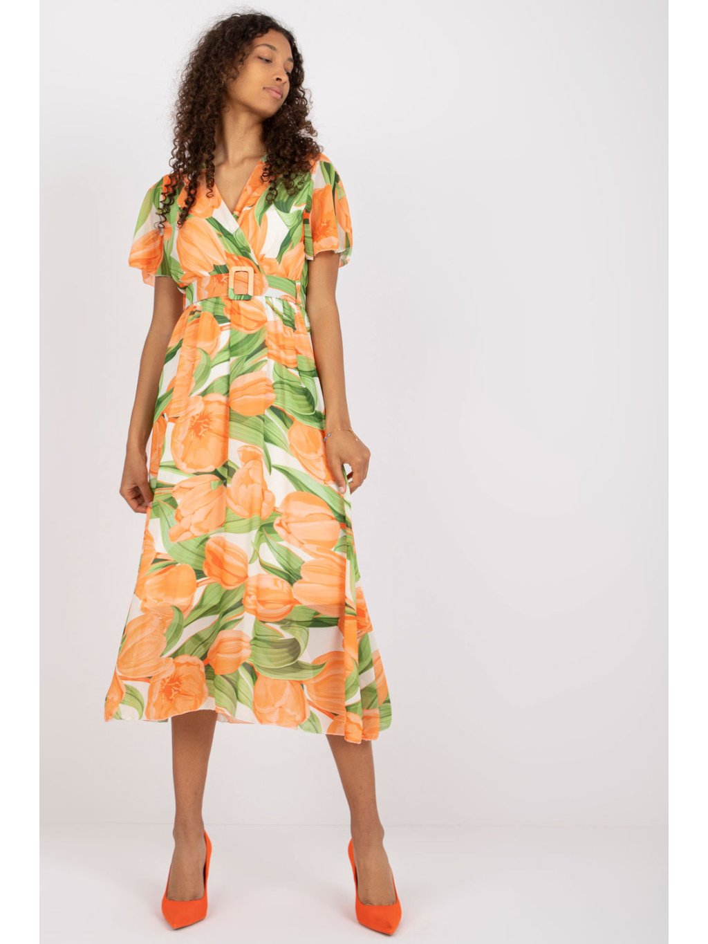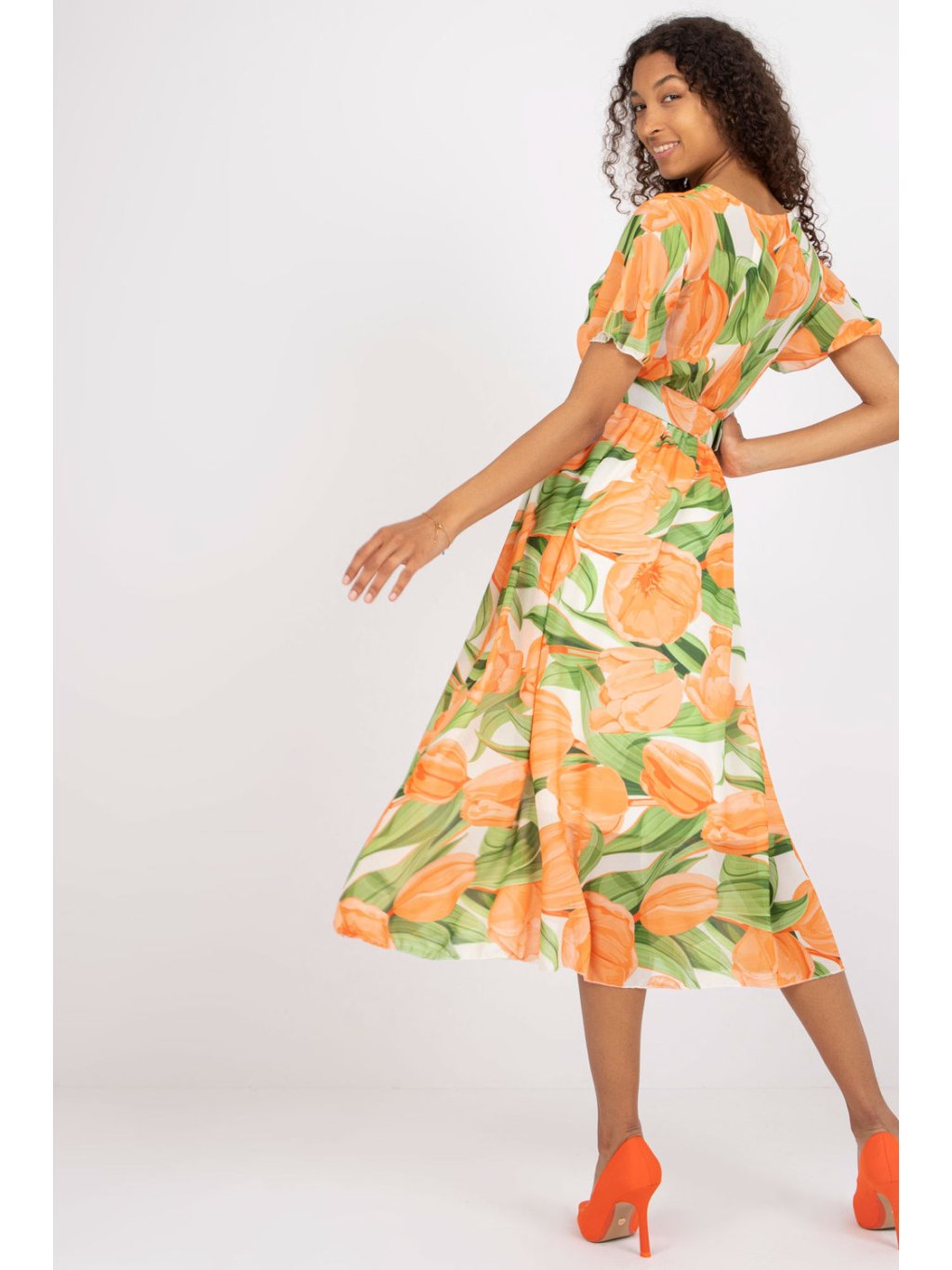 Letní šaty s krátkými rukávy v podobě volánků. Šaty s podšívkou. Obálkový výstřih, pásek v pase, rozšířená spodní část. Ideální pro mnoho příležitostí.
