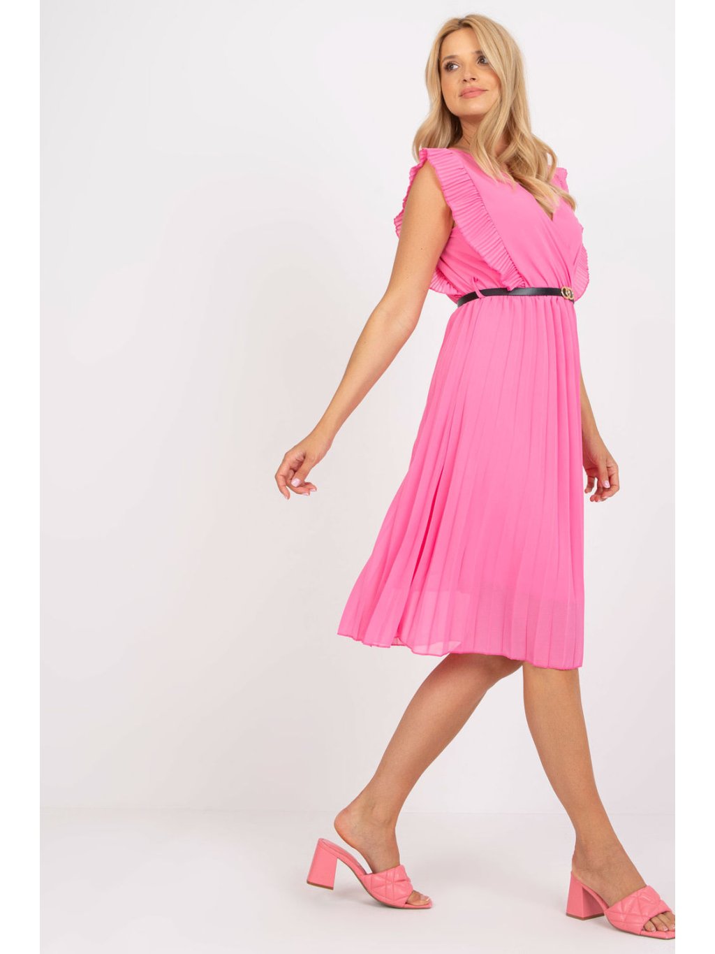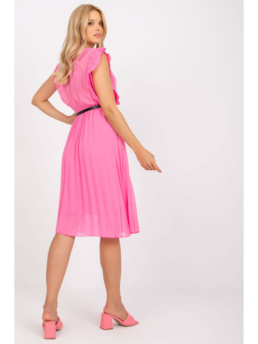 Plisované letní šaty pro mnoho příležitostí s krátkými rukávy v podobě volánku. Šaty mají podšívku, elastický pas a srdíčkový výstřih. Šaty mají rozšířený střih a kromě volánků jsou doplněny páskem v pase.