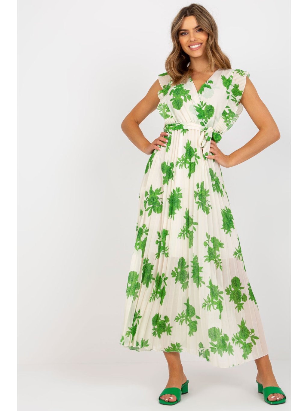 Dlouhé šaty s krátkými rukávy ve tvaru volánu. Zavazování v pase, plisovaná spodní část šatů. Perfektní letní nabídka.