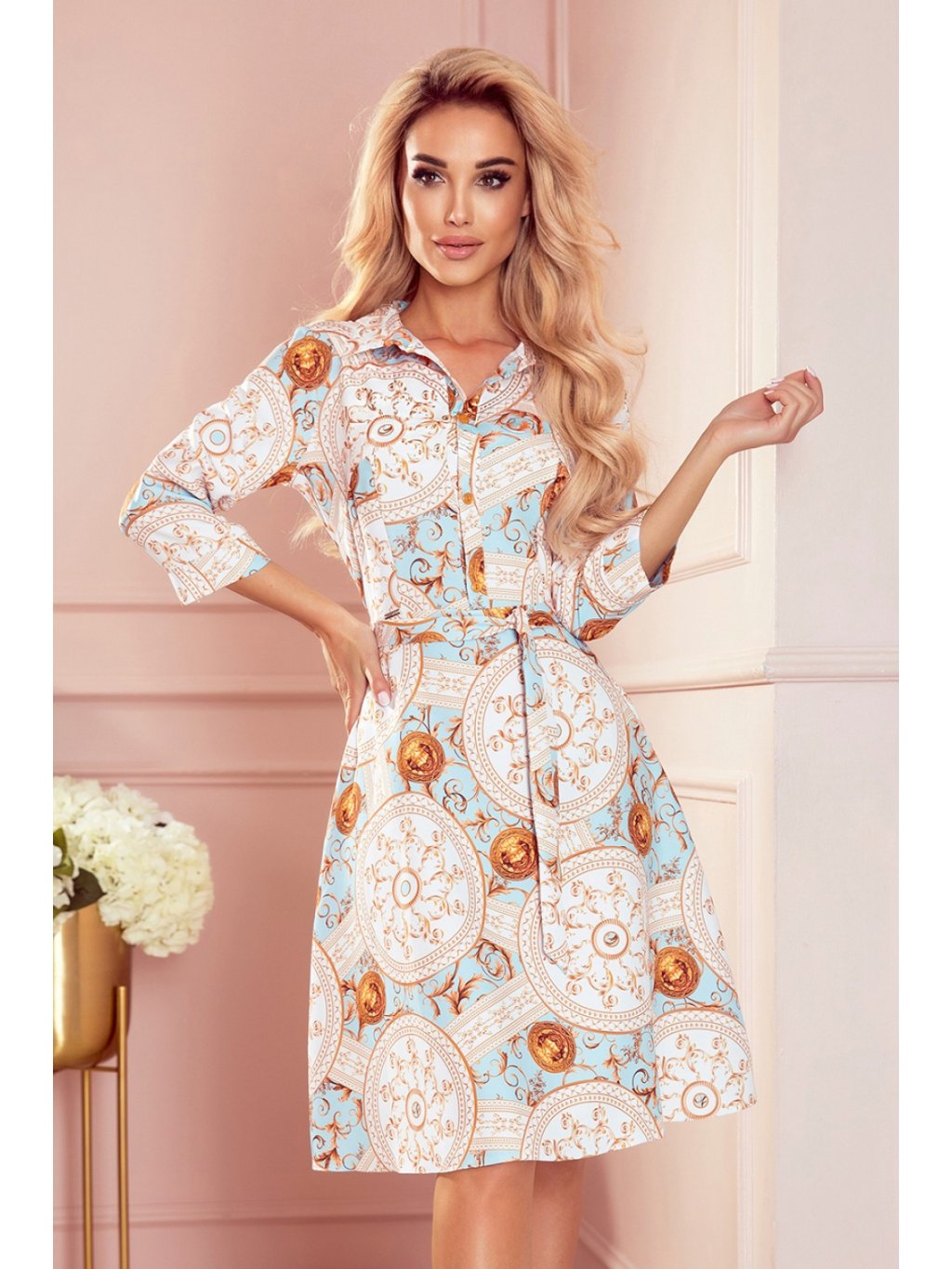Šaty na ramínka v bílé barvě a zlatých kruzích na tyrkysovém pozadí. Vyrobeno z materiálu příjemného na dotek s nízkou elasticitou. Značka numoco.