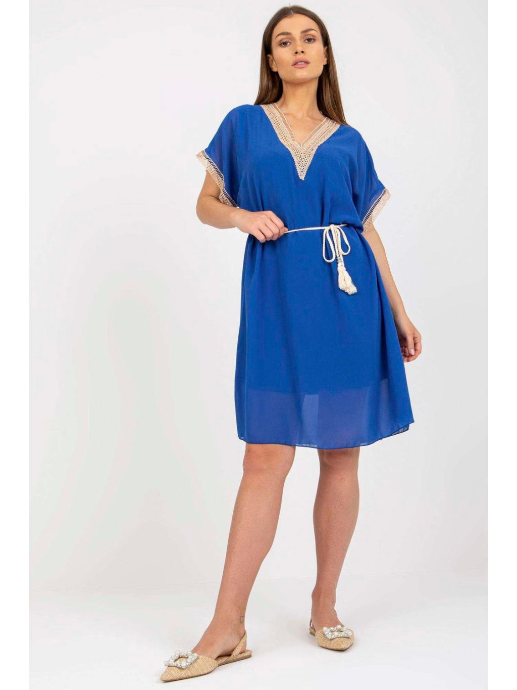 Volné šaty s krátkými rukávy a srdíčkovým výstřihem. Šaty jsou podšité, zavazují se v pase. Šaty s ažurovými vsadkami.