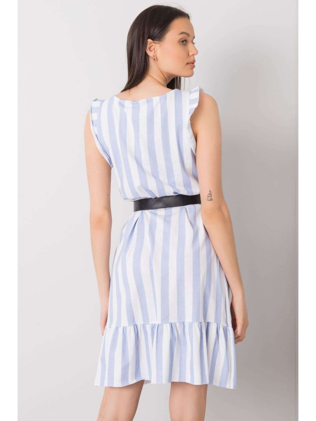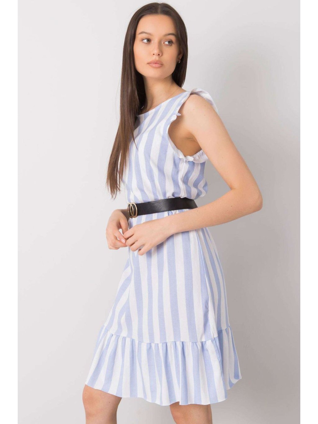 Letní šaty bez rukávů s ozdobnými volánky a kulatým výstřihem. Šaty z pruhované látky. Včetně opasku.