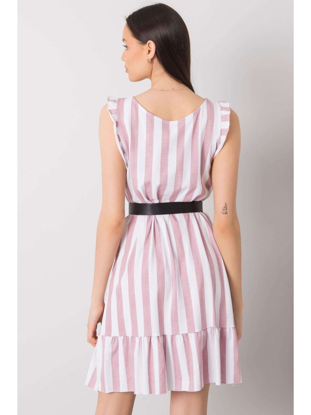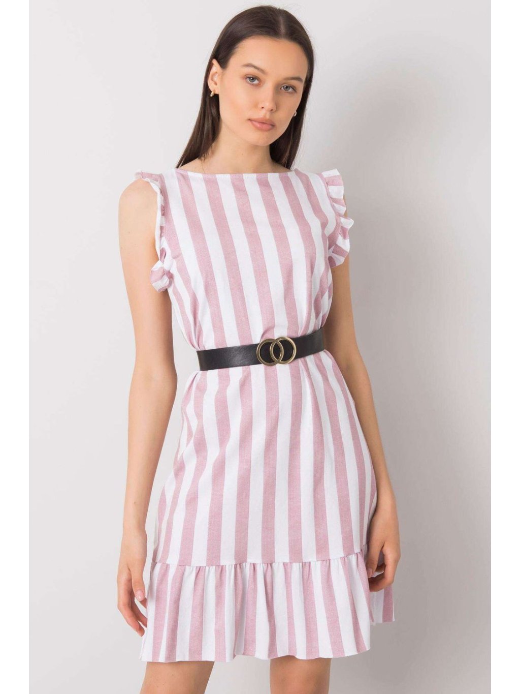 Letní šaty bez rukávů s ozdobnými volánky a kulatým výstřihem. Šaty z pruhované látky. Včetně opasku.