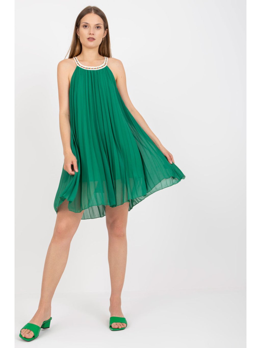 Letní plisované šaty na ramínka. Šaty s kulatým výstřihem, mají podšívku.