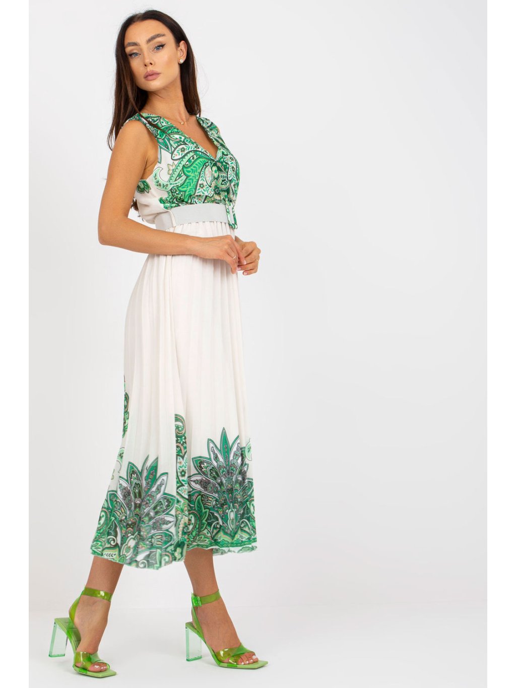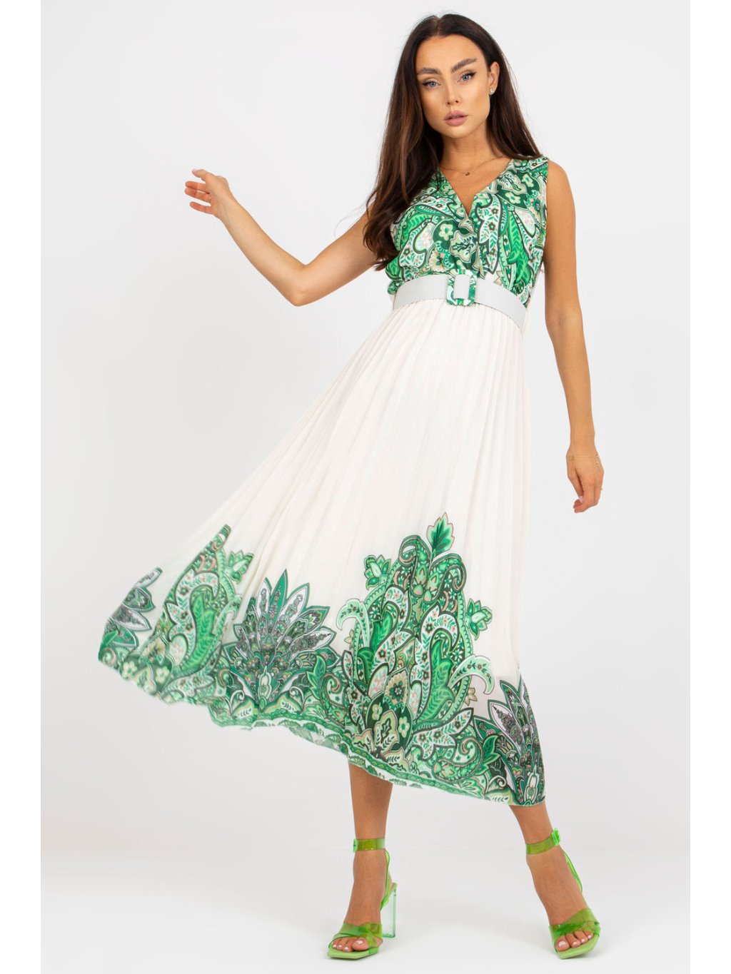 Letní rozevláté šaty bez rukávů, s podšívkou. Obálkový výstřih, plisovaný spodní díl, pásek pro doplnění vzhledu.