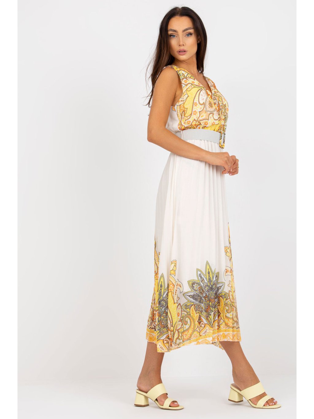 Letní rozevláté šaty bez rukávů, s podšívkou. Obálkový výstřih, plisovaný spodní díl, pásek pro doplnění vzhledu.