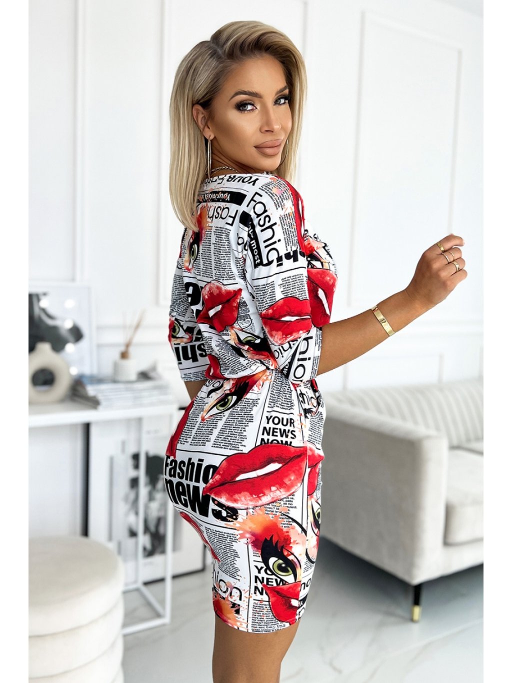 Sportovní šaty s kosticemi, kapsami a 3/4 rukávy. Šaty z bílé látky s novinovým vzorem a červenými rty. Vyrobeno z elastické tkaniny s mírně semišovou strukturou. Polský výrobek. Značka numoco.