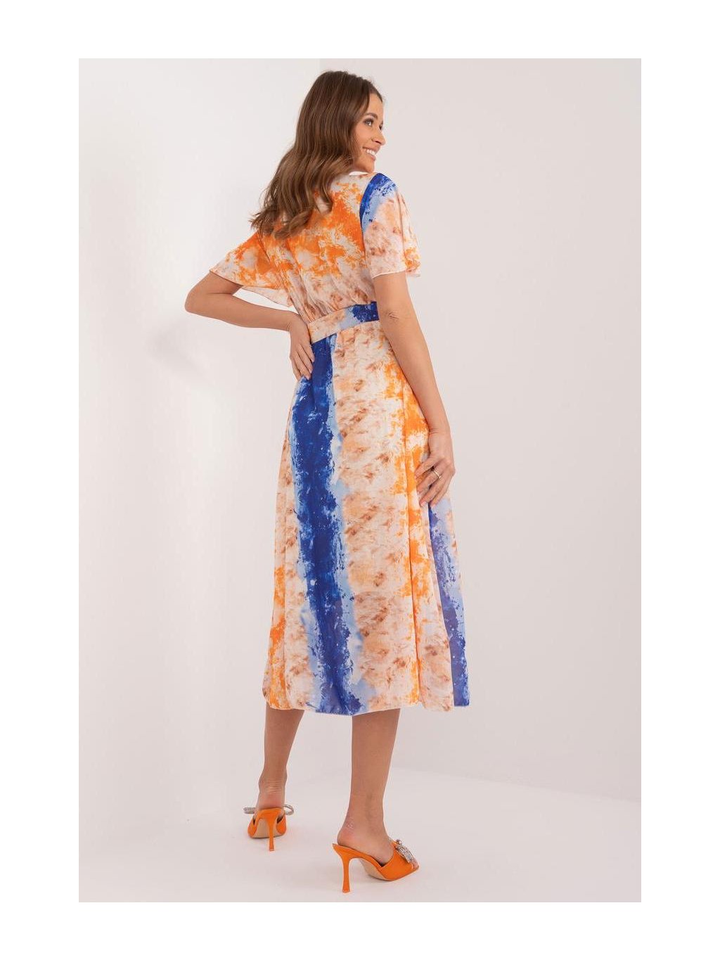 Tyto šaty jsou ideální volbou pro každodenní nošení a kombinují pohodlí s osobitým stylem. Jsou vyrobeny z látky zdobené barevným potiskem a dodají každému kompletu svěžest a energii. Krátké rukávy poskytují volnost pohybu a midi délka dodává šatům univerzální charakter, který se skvěle hodí pro různé příležitosti. Jako každodenní šaty byly navrženy s ohledem na pohodlí a funkčnost. Jsou vybaveny páskem se zapínáním na přezku, který zvýrazňuje pas a dodává siluetě ženský tvar. Šaty jsou navíc podšité pro větší pohodlí a lepší padnutí. Díky rovnému střihu se snadno stylizují a hodí se jak pro běžné, tak pro formálnější příležitosti. Tyto šaty se skvěle hodí na setkání s přáteli, na nákupy nebo na procházku a díky nim bude každý den plný stylu a sebevědomí.