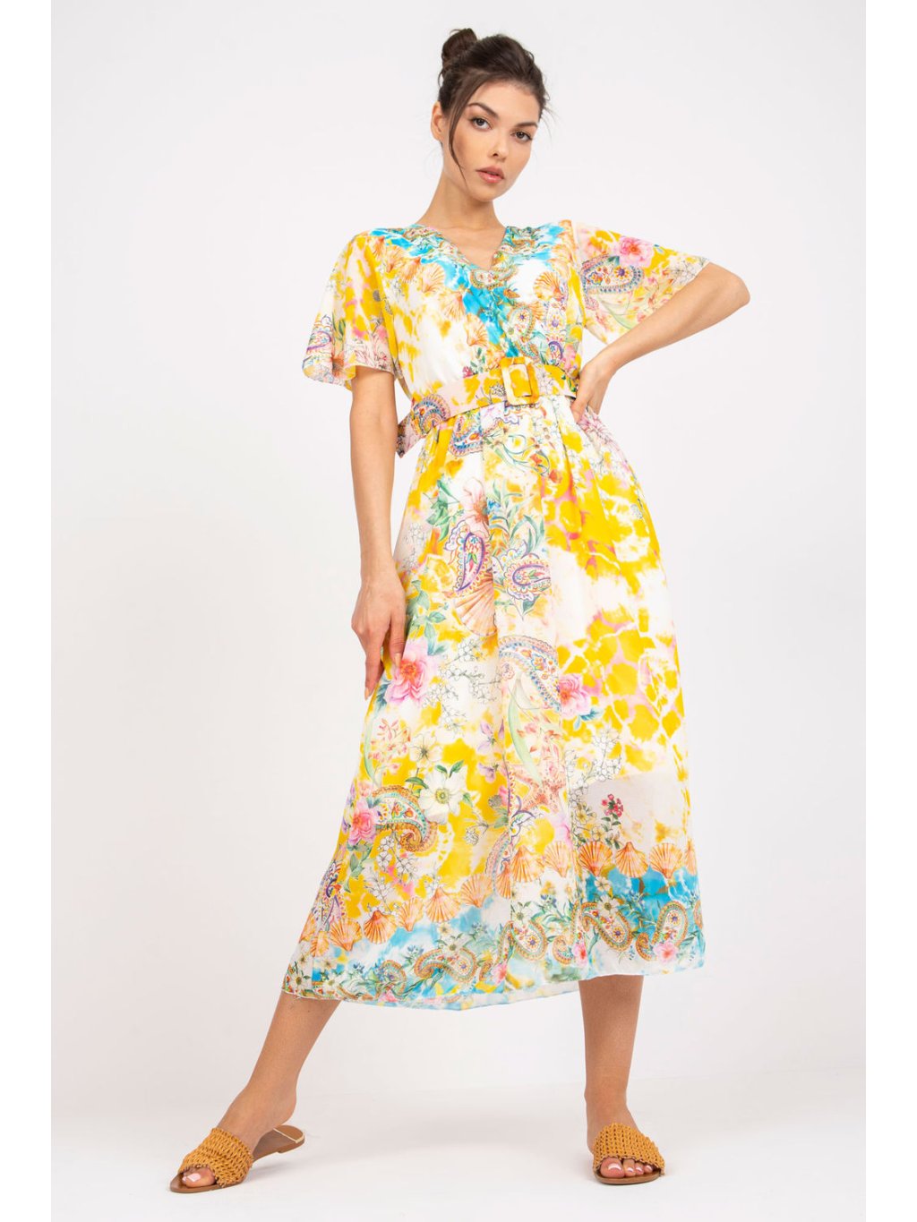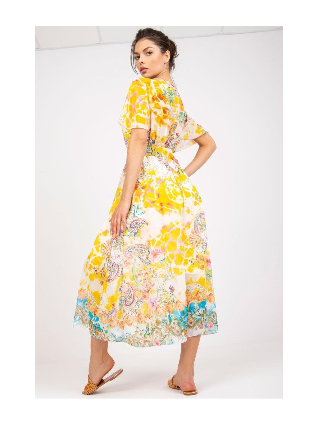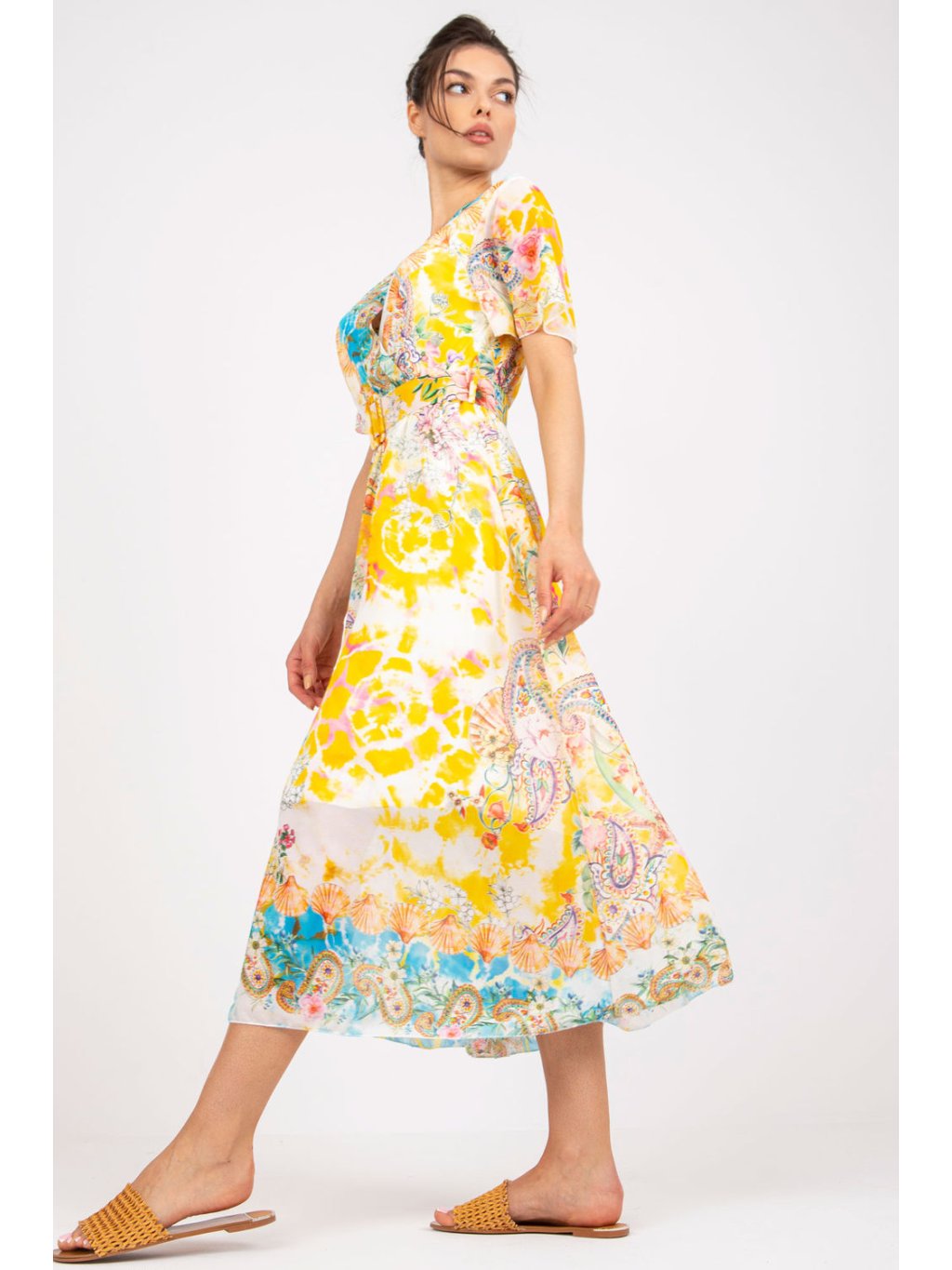 Tyto šaty jsou typickým příkladem každodenní elegance, která v sobě spojuje pohodlí a styl. Díky barevnému potisku dodávají šatům zábavný a energický nádech a skvěle se hodí pro každou příležitost. Díky rozšířenému střihu jsou mimořádně ženské a hodí se na společenské akce i do práce. Šaty jsou vyrobeny z polyesteru, snadno se udržují a ošetřují, přičemž si dlouho zachovávají dokonalý vzhled. Jejich midi délka jim dodává univerzální charakter, který lze snadno přizpůsobit různým příležitostem. Krátké rukávy a obálkový výstřih dodávají šatům jemnost a ženskou eleganci a zdůrazňují jemnost siluety. Šaty jsou navíc podšité pro větší pohodlí a lepší padnutí. Pro zvýraznění pasu a dodání většího šmrncu je součástí šatů pásek v barvě potisku. Díky kombinaci stylu, pohodlí a funkčnosti se tyto šaty stanou nepostradatelným kouskem šatníku, díky kterému bude každý den plný sebevědomí a elegance.