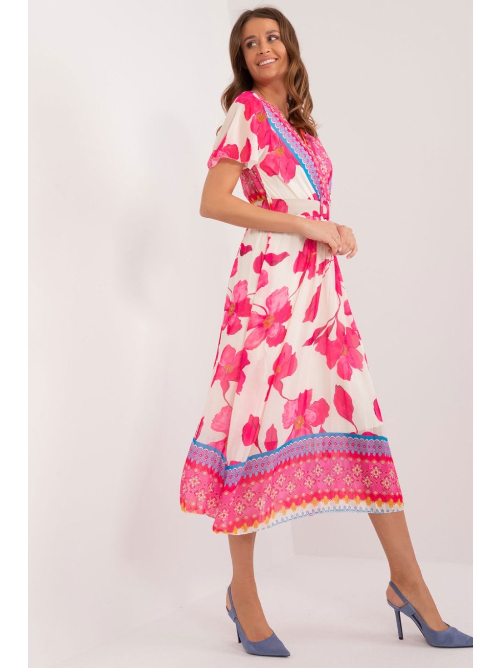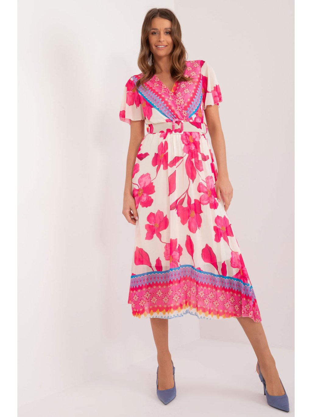 Letní šaty s krátkými rukávy v podobě volánků. Šaty s podšívkou. Obálkový výstřih, v pase zapínání na pásek, nařasený spodní lem. Ideální pro mnoho příležitostí.