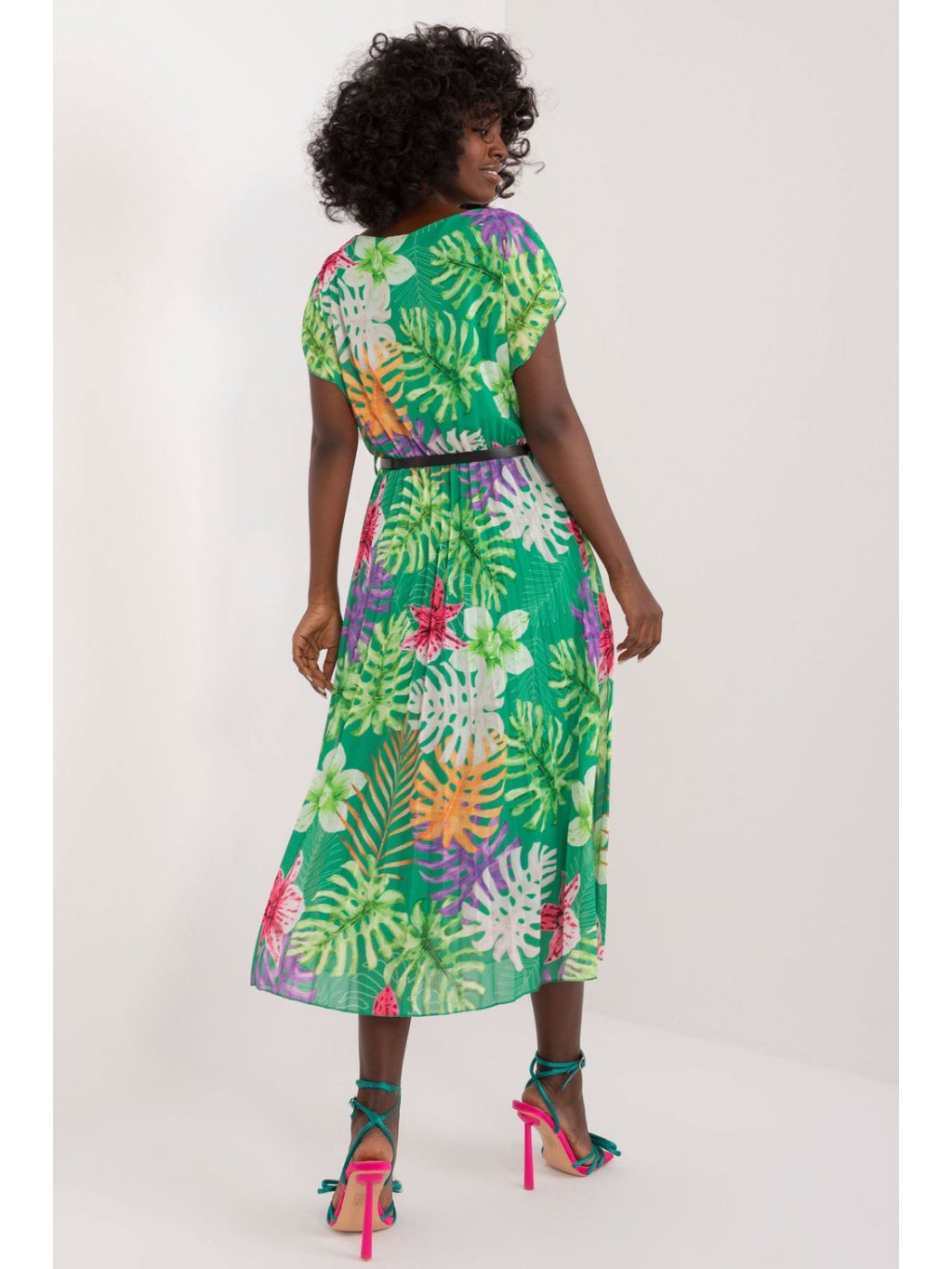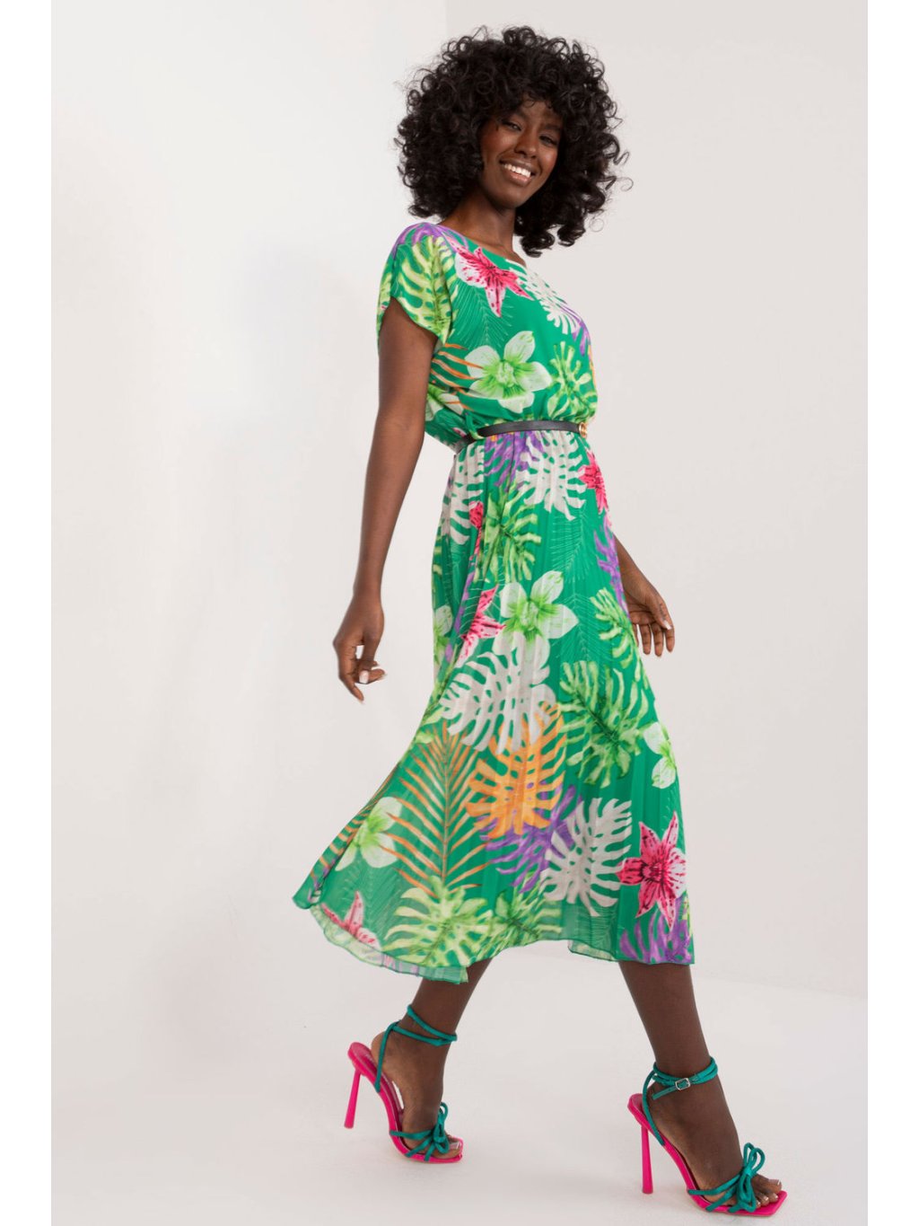 Letní šaty s krátkými rukávy, kulatým výstřihem a rozšířeným lemem. Šaty z barevné vzorované látky s podšívkou. Ideální pro mnoho příležitostí.