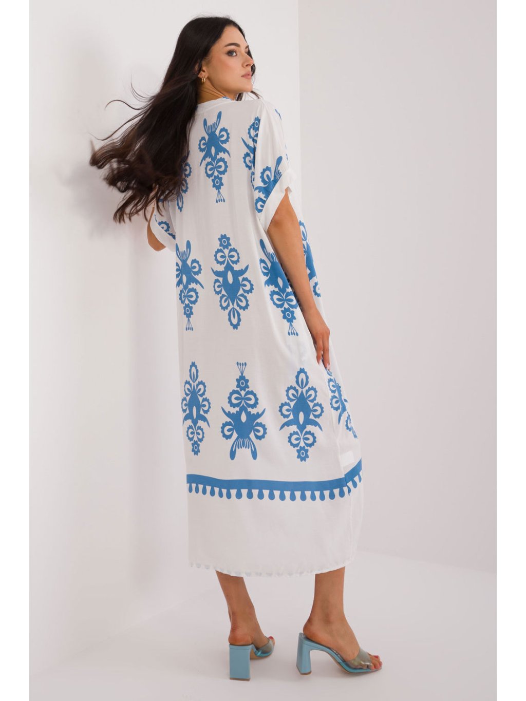 Letní boho šaty, ideální pro každodenní nošení i do práce. Tyto každodenní košilové šaty oversize střihu poskytují pohodlí a volnost pohybu a kombinují styl s pohodlím. Šaty zdobí barevný potisk pro svěží a energický vzhled. Jsou vyrobeny z viskózy, dominantního materiálu, který zaručuje prodyšnost a příjemné nošení. Šaty sahají ke kolenům (midi délka) mají krátké rukávy, takže jsou ideální volbou pro teplé dny. Srdíčkový výstřih s přidaným stojáčkem dodává eleganci a originalitu a vytváří harmonický boho styl.
