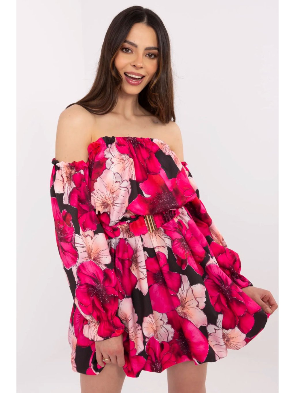 Elegantní letní šaty ve střihu rozevlátého, ideální na každodenní i společenské příležitosti. Vyrobené z kombinace polyesteru, viskózy a elastanu, poskytují pohodlí a lehkost, ideální na teplé dny. Květinový vzor dodává ženskému šarmu a svěžesti, vytvářející výjimečný, romantický vzhled. Šaty mají mini délku, dlouhé nafouklé rukávy a výstřih ve stylu španělky, který krásně zdůrazňuje ramena. Další výhodou je zapínání pásku, který umožňuje zdůraznění pasu a přizpůsobení šatů postavě. Vnitřek šatů je vybaven podšívkou, což zvyšuje pohodlí nošení. Díky absenci zapínání jsou šaty snadno nasazovatelné. Ideální na letní dny, jak do každodenního života, tak na formálnější události, spojující pohodlí s elegancí.