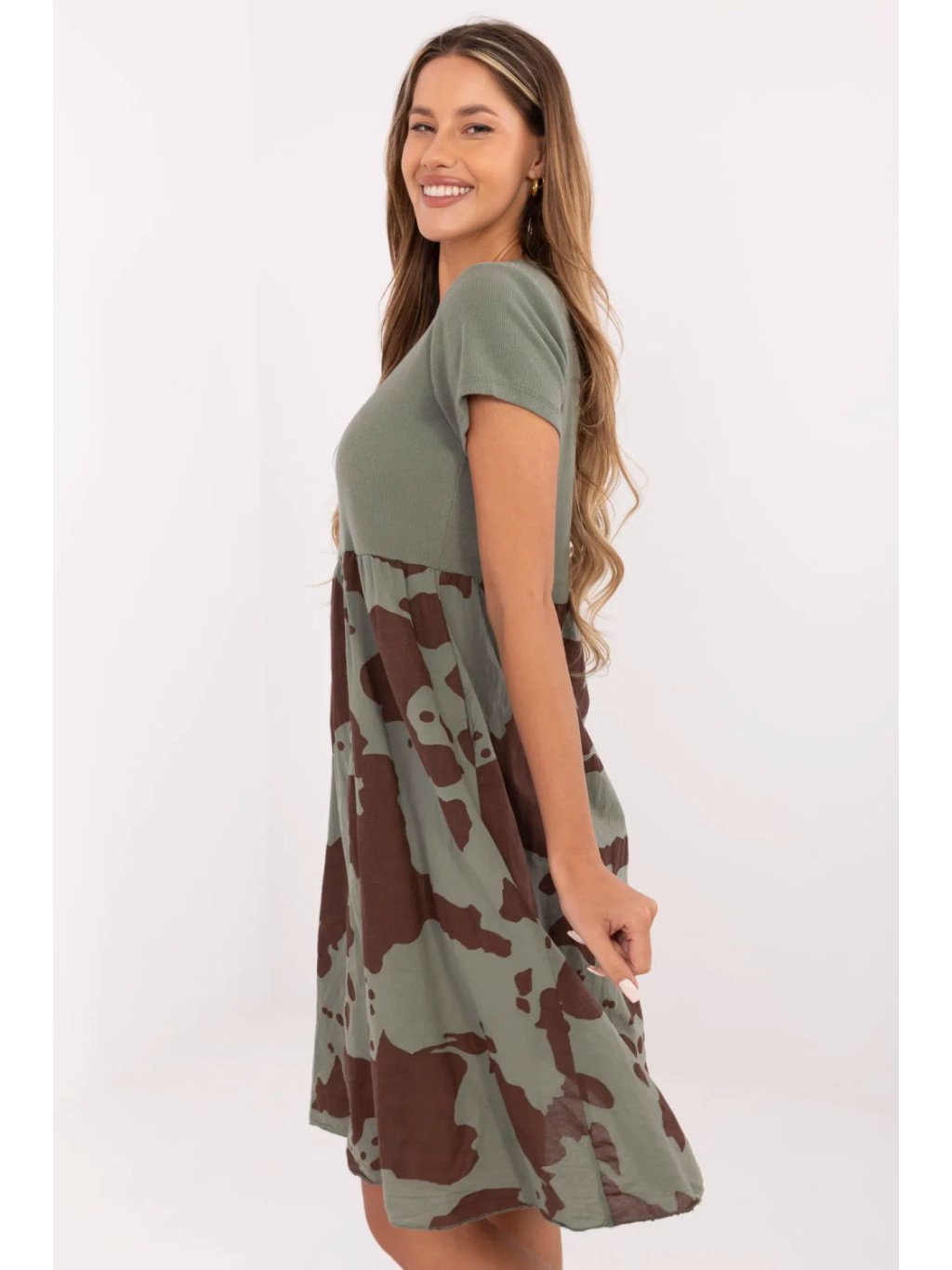 Tato letní, rozklosaná šaty jsou spojením pohodlí, stylu a originálního designu. Vyrobené z prodyšné směsi bavlny a elastanu, skvěle se hodí na každý den, jak ve městě, tak během letního odpočinku. Horní část šatů je ušita z pruhované látky, která jemně kopíruje siluetu, zdůrazňující její přednosti. Výstřih do šálku a krátké rukávy dodávají celku lehkost a ženské kouzlo. Spodní část šatů zdobí originální zvířecí motiv, který přidává charakter a prolomuje klasický, hladký vrch. Model po kolena je nejen stylový, ale i funkční, má praktické kapsy skryté v bocích švů, které zvyšují pohodlí nošení. Tyto šaty jsou ideální na každodenní výlety, spojují jednoduchost s trochou divokého akcentu, vytvářející výjimečnou nabídku pro ženy, které oceňují pohodlí a módní vzhled.