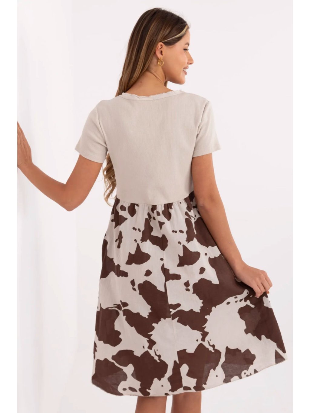 Tato letní, rozklosané šaty jsou spojením pohodlí, stylu a originálního designu. Vyrobené z prodyšné směsi bavlny a elastanu, skvěle se hodí na každodenní nošení, jak ve městě, tak během letní dovolené. Horní část šatů je ušita z pruhované látky, která jemně kopíruje siluetu, zdůrazňuje její přednosti. Výstřih do srdce a krátké rukávy dodávají celku lehkost a ženský šarm. Spodní část šatů zdobí originální zvířecí motiv, který přidává charakter a prolomuje klasickou, hladkou horní část. Model po kolena není jen stylový, ale i funkční, má praktické kapsy skryté v bocích švů, které zvyšují pohodlí nošení. Tyto šaty jsou ideální na každodenní nošení, spojují v sobě jednoduchost s trochou divokého akcentu, vytvářejí tak výjimečnou nabídku pro ženy, které ocení pohodlí a módní vzhled.
