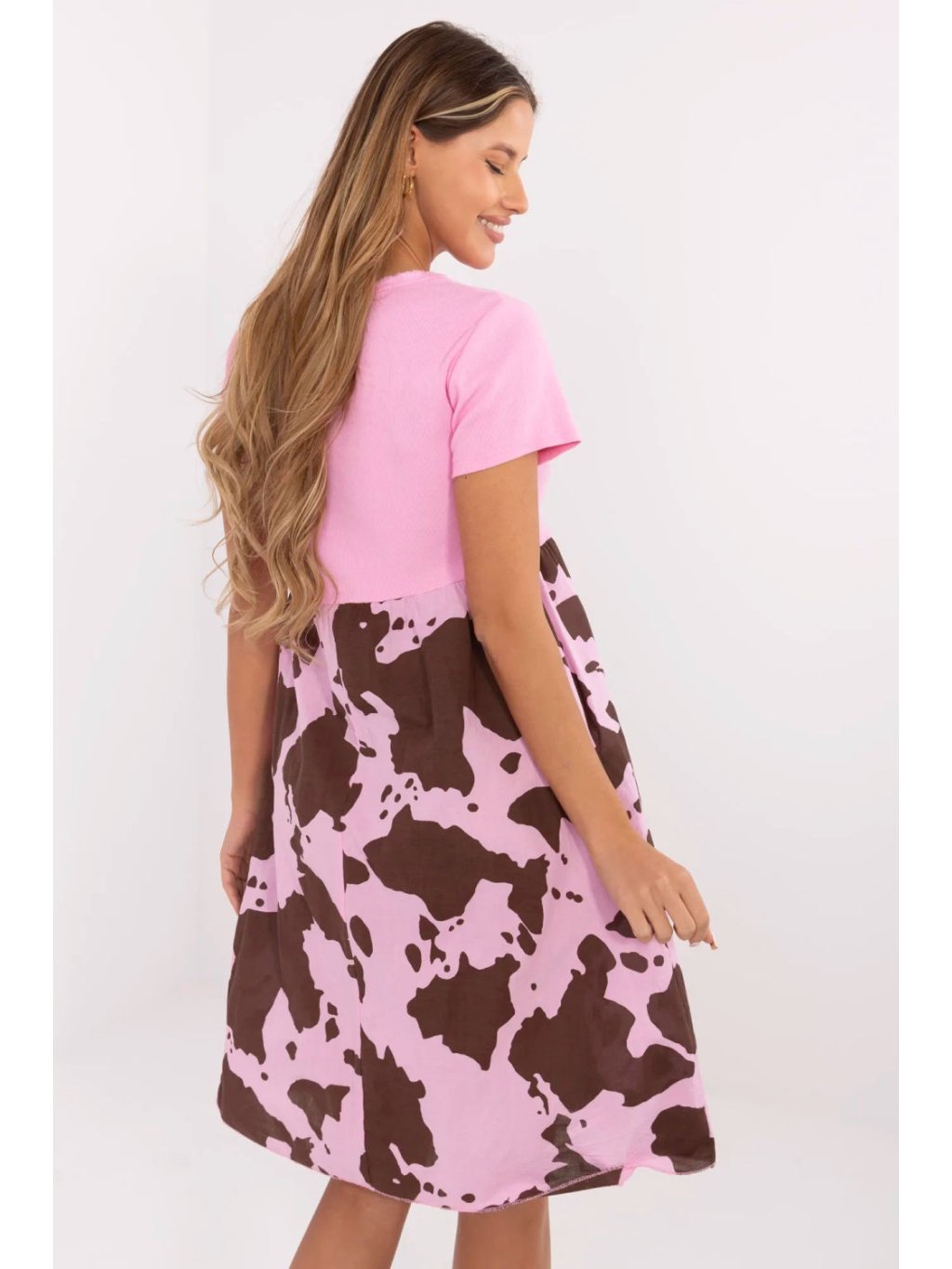 Tato letní, rozkloskané šaty jsou kombinací pohodlí, stylu a originálního designu. Vyrobené z prodyšné směsi bavlny a elastanu, skvěle se hodí na každý den, jak ve městě, tak během letní dovolené. Horní část šatů je ušita z pruhované látky, která jemně kopíruje siluetu, zdůrazňující její přednosti. Výstřih do šípu a krátké rukávy dodávají celku lehkost a ženské kouzlo. Spodek šatů zdobí originální zvířecí motiv, který přidává charakter a prolomuje klasický, hladký vrch. Model po kolena není pouze stylový, ale i funkční, má praktické kapsy skryté v bočních švech, které zvyšují pohodlí nošení. Tyto šaty jsou ideální na každodenní nošení, spojují v sobě jednoduchost s trochou divokého akcentu, vytvářejíce tak jedinečnou nabídku pro ženy, které ocení pohodlí a módní vzhled.