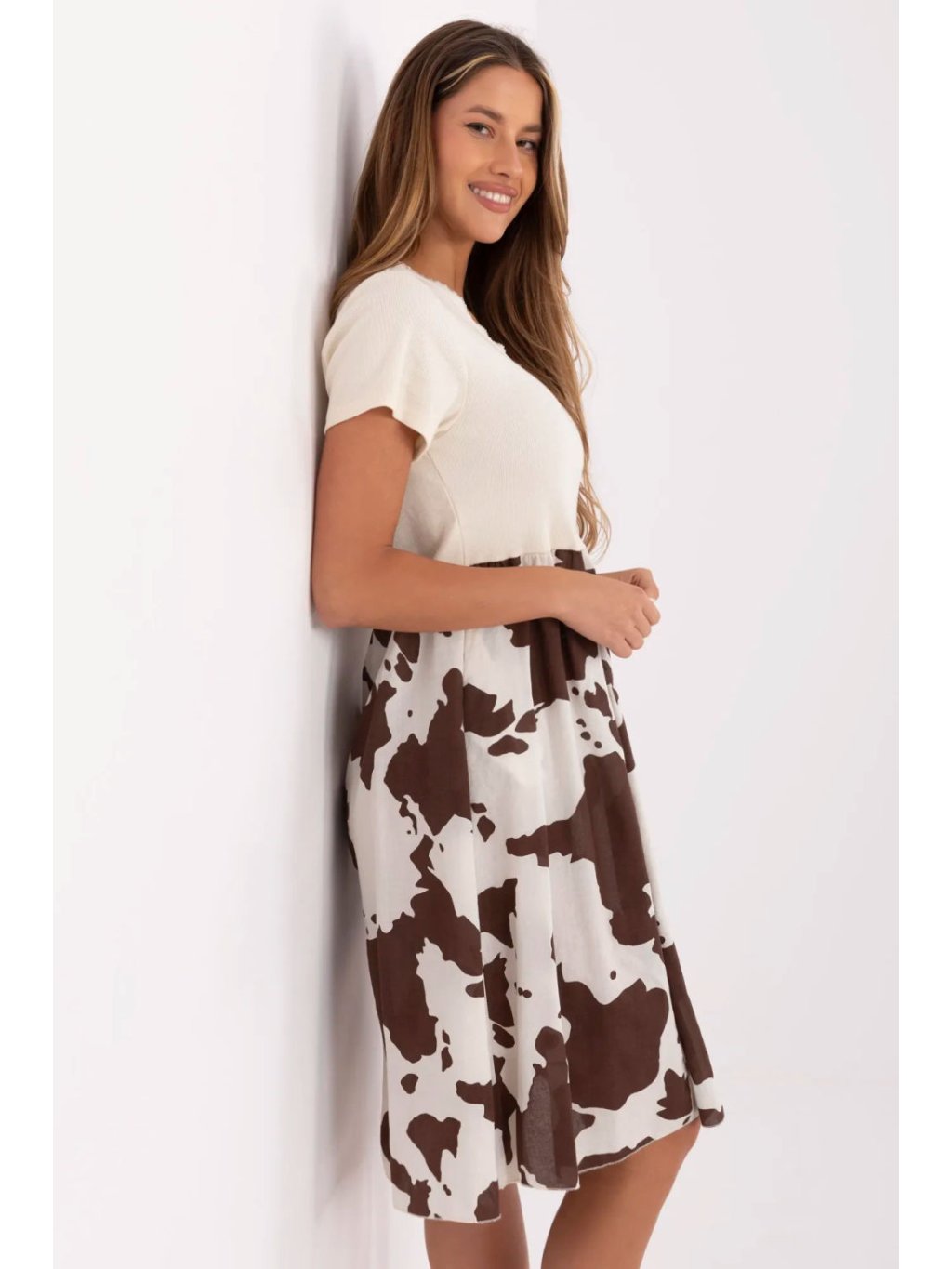 Tato letní, rozklosané šaty jsou kombinací pohodlí, stylu a originálního designu. Vyrobené z prodyšné směsi bavlny a elastanu, skvěle poslouží každý den, jak ve městě, tak během letní dovolené. Horní část šatů je vyrobena z pruhované látky, která jemně kopíruje postavu, zdůrazňující její přednosti. Výstřih do srdce a krátké rukávy dodávají celku lehkost a ženský půvab. Spod šatů zdobí originální zvířecí motiv, který dodává charakter a prolomuje klasický, hladký vrch. Model po kolena není jen stylový, ale i funkční, má praktické kapsy skryté v bocích švů, které zvyšují pohodlí nošení. Tyto šaty jsou ideální na každodenní výlety, kombinují jednoduchost s trochou divokého akcentu, vytvářejí tak výjimečný návrh pro ženy, které ocení pohodlí a módní vzhled.