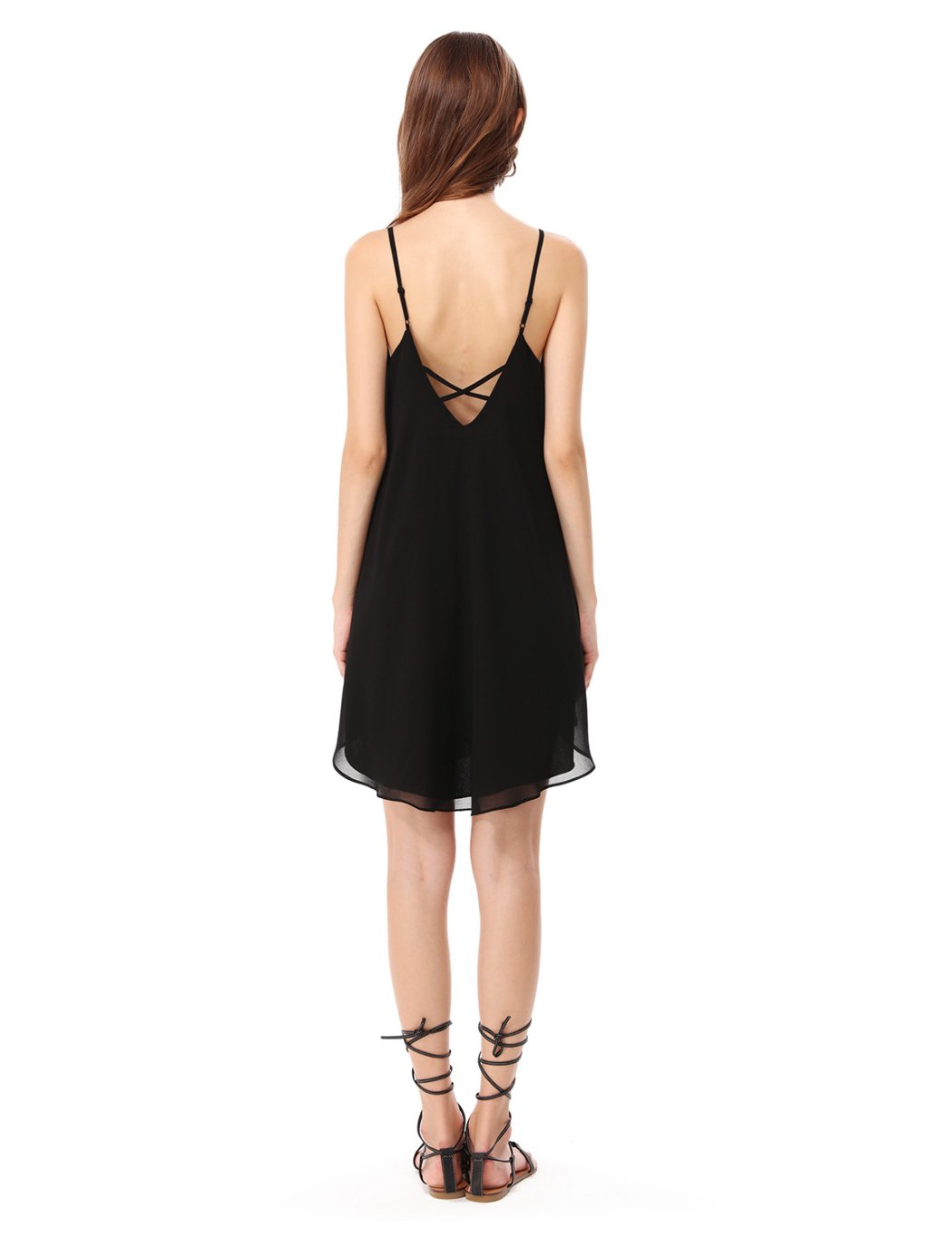 Krátké černé letní šaty na špagetová ramínka. Šaty mají velký výstřih na prsou i na zádech. Jsou volného střihu. Lehoučký a pohodlný materiál.