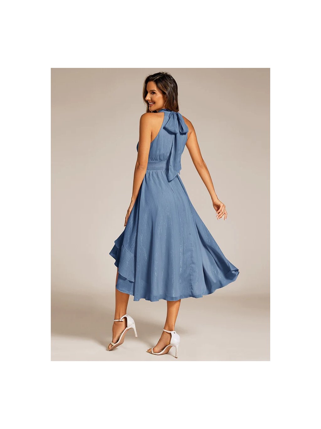 Šaty černé střední délky s ohlávkovým výstřihem , v zadu zapínání až ke krku s velkou mašlí, bez rukávů. Dole na šatech je široký lem který jim dává bohatost.
