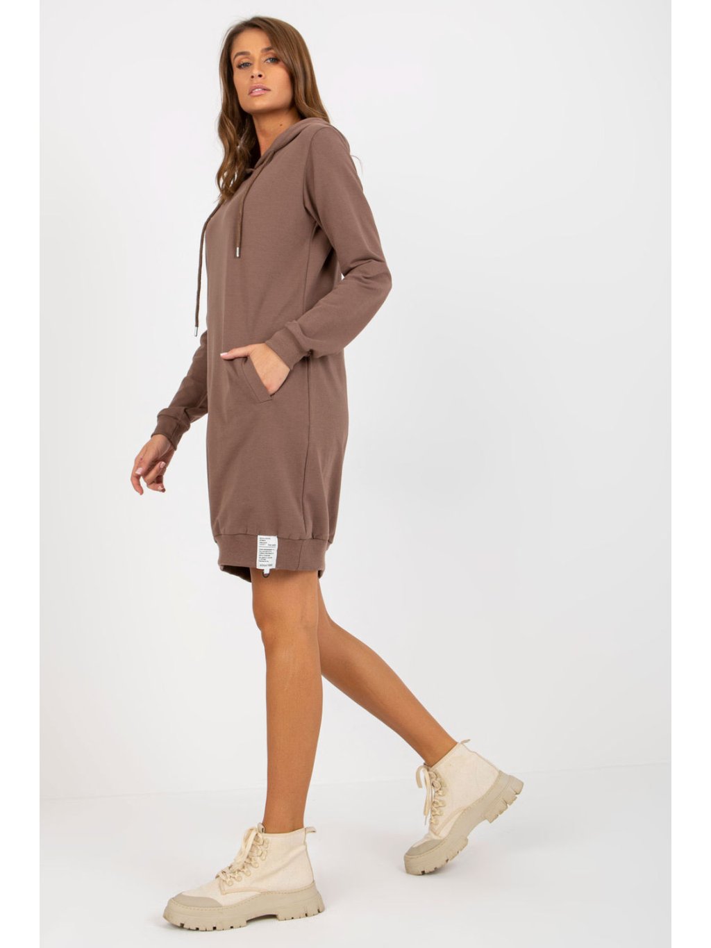 Mikinové šaty s dlouhými rukávy a kapucí. Šaty mají nakládané kapsy.