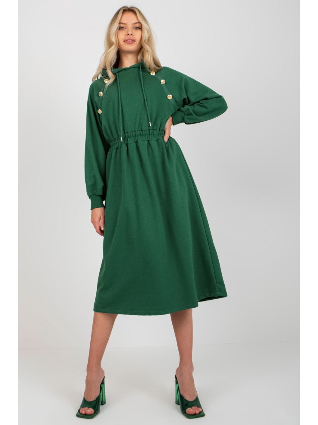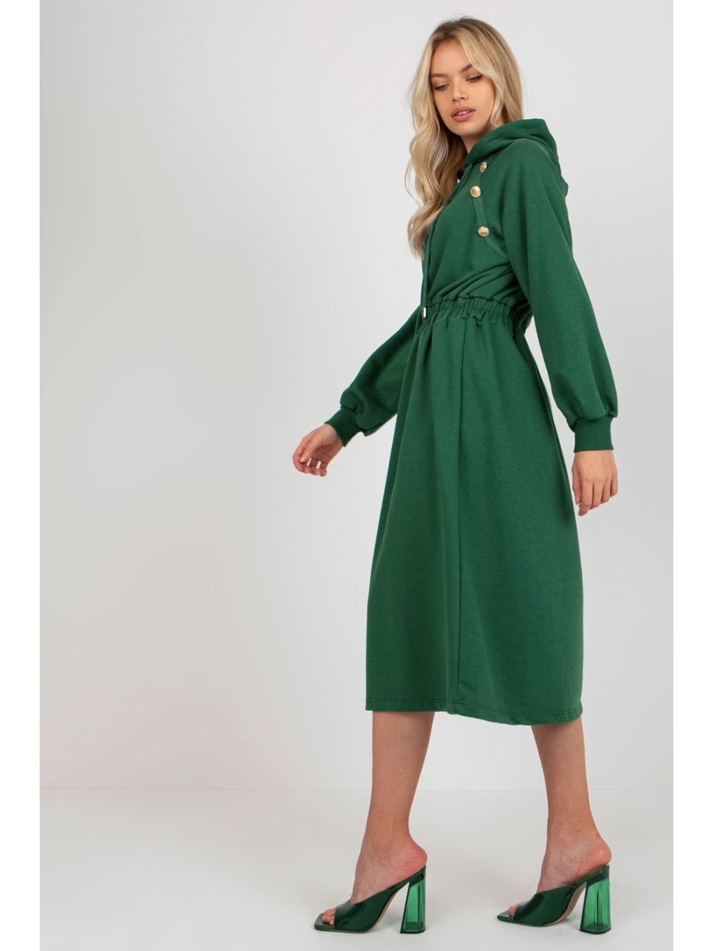 Mikinové šaty s dlouhými rukávy a kapucí. Elastický pas, ozdobné knoflíky na přední straně. Každodenní nabídka.