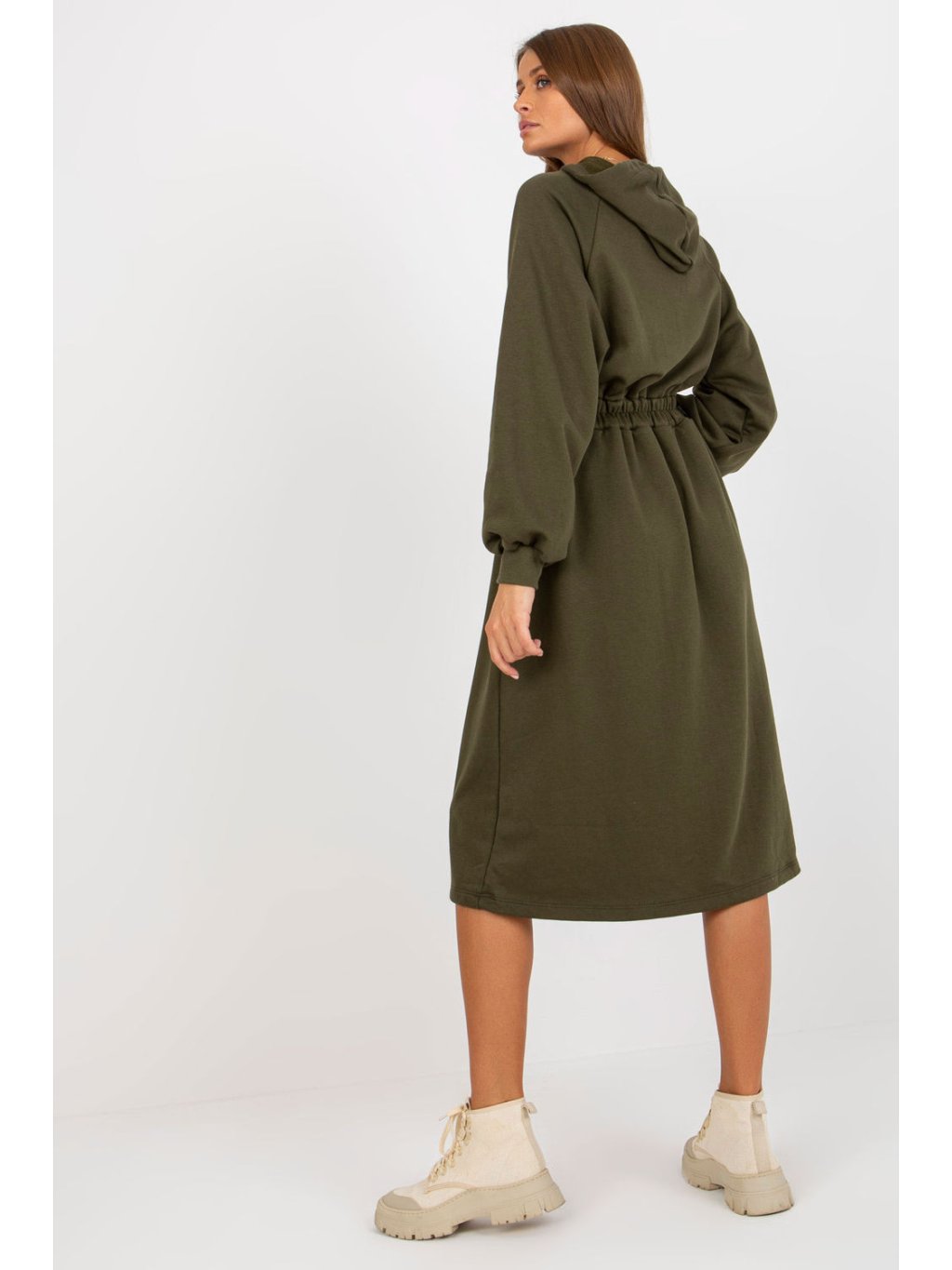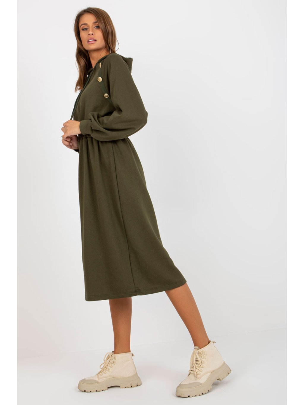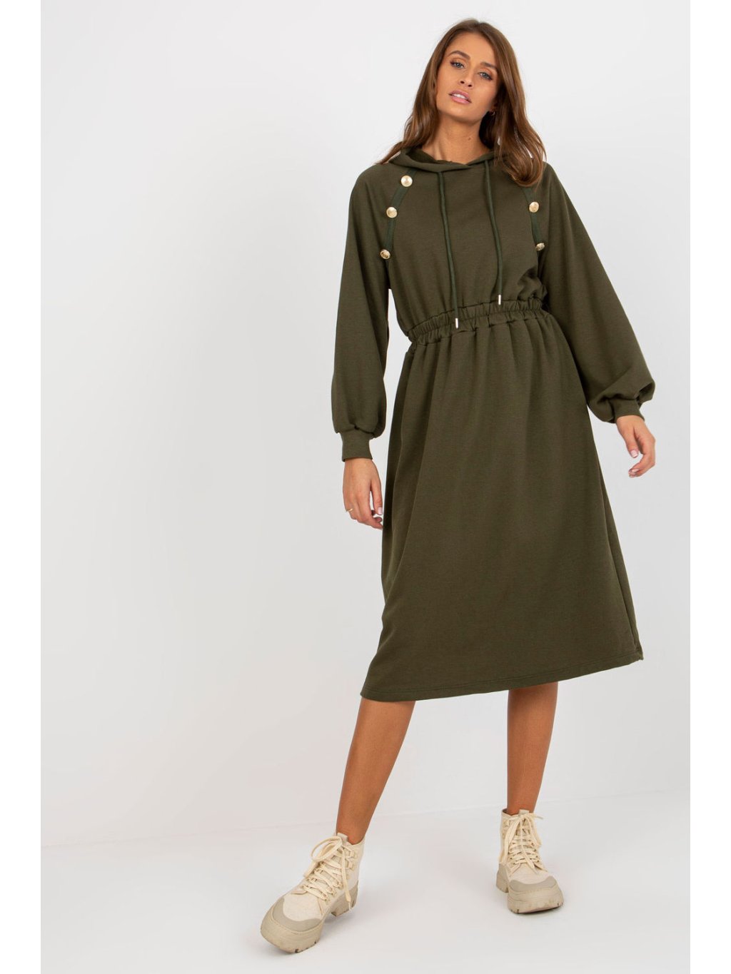 Mikinové šaty s dlouhými rukávy a kapucí. Elastický pas, ozdobné knoflíky na přední straně. Každodenní nabídka.