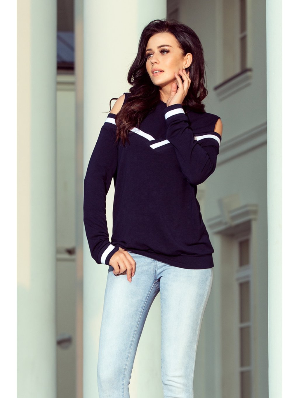 Pohodlná tmavě modrá mikina s odhalenými rameny - zakončená velmi módními švy v bílé a tmavě modré barvě. Polský výrobek.