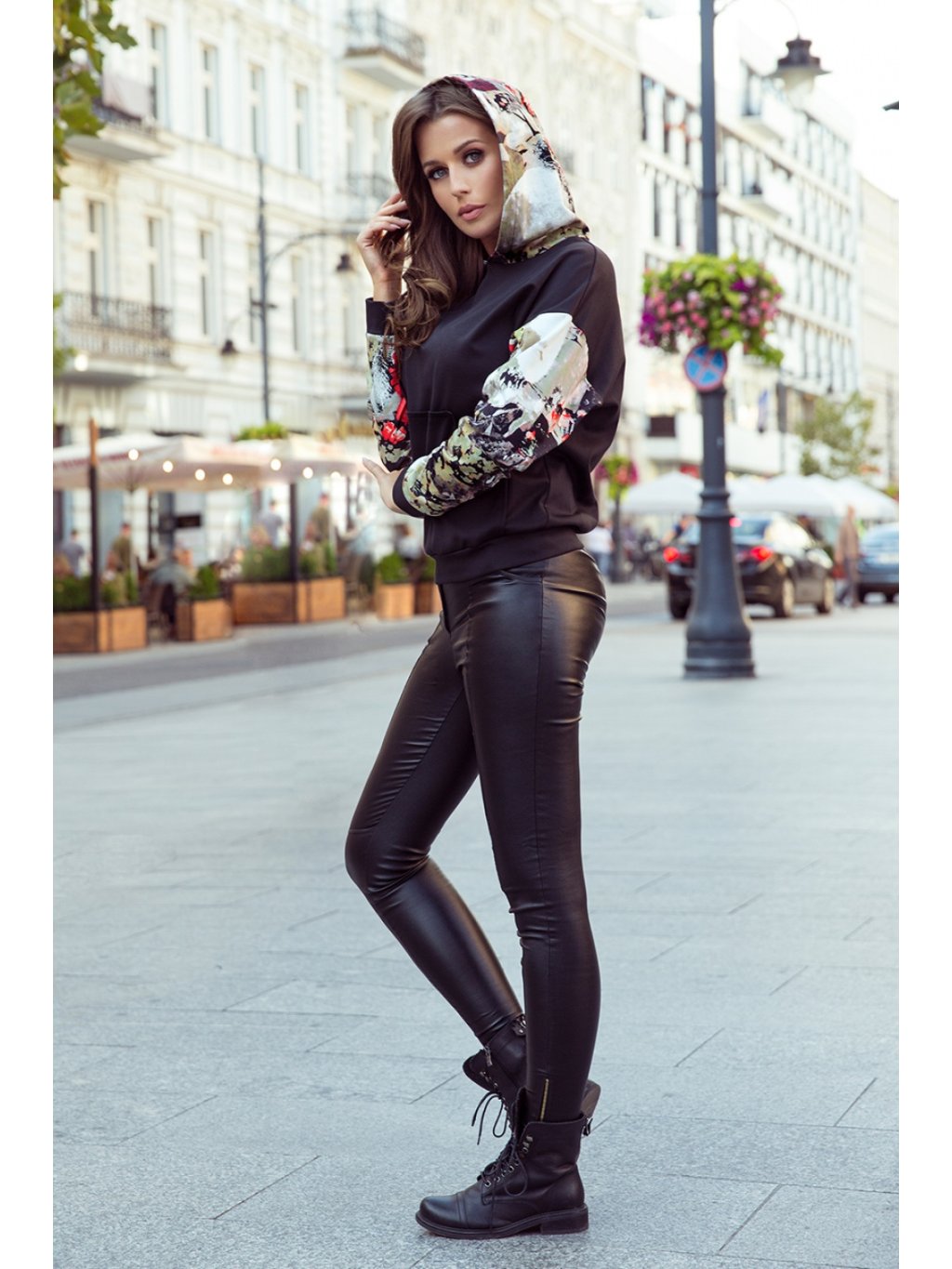 Pohodlná klokaní mikina s kapucí v černé barvě s barevnými vsadkami. Vyrobeno z hřejivého a mírně elastického materiálu. Polský výrobek. Značka numoco.