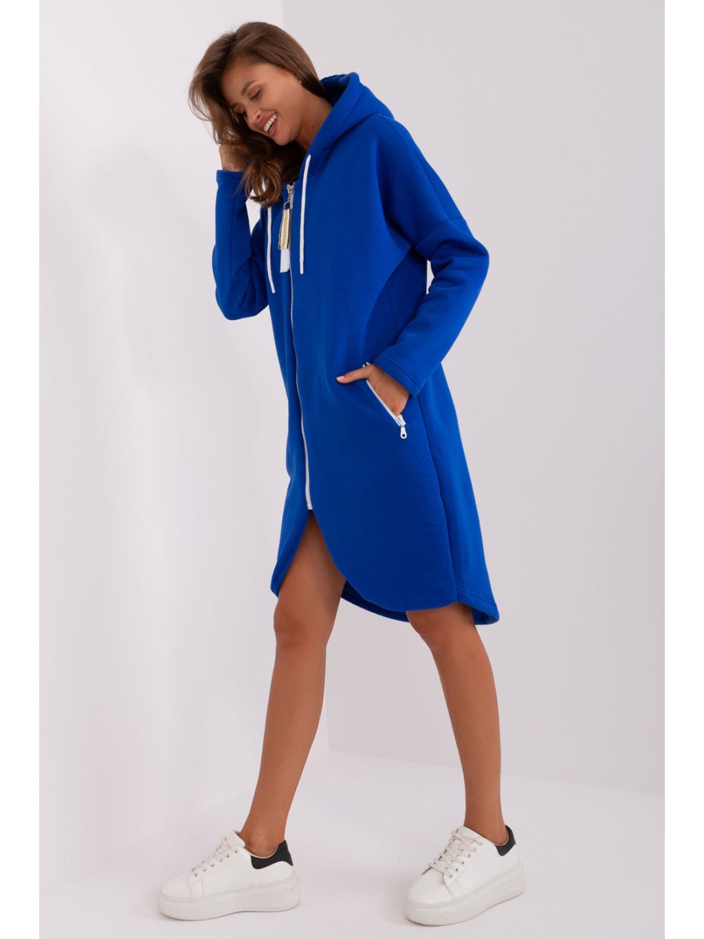 Dámská mikina s prodlouženým střihem, dlouhými rukávy a kapucí. Mikina se zapíná na zip a na bocích má kapsy na zip.
