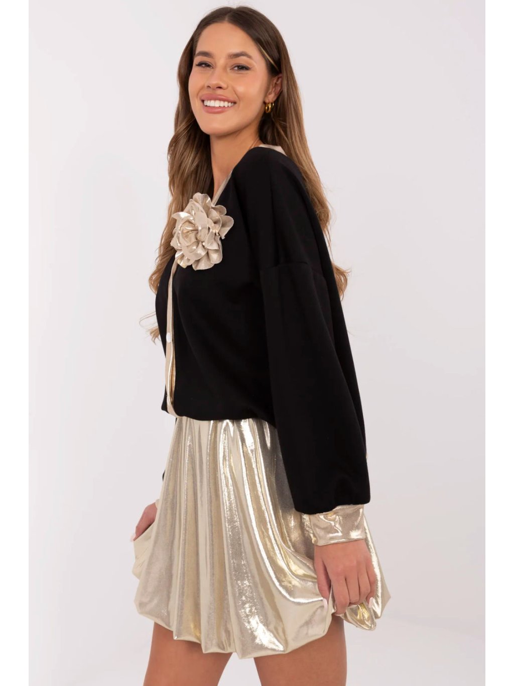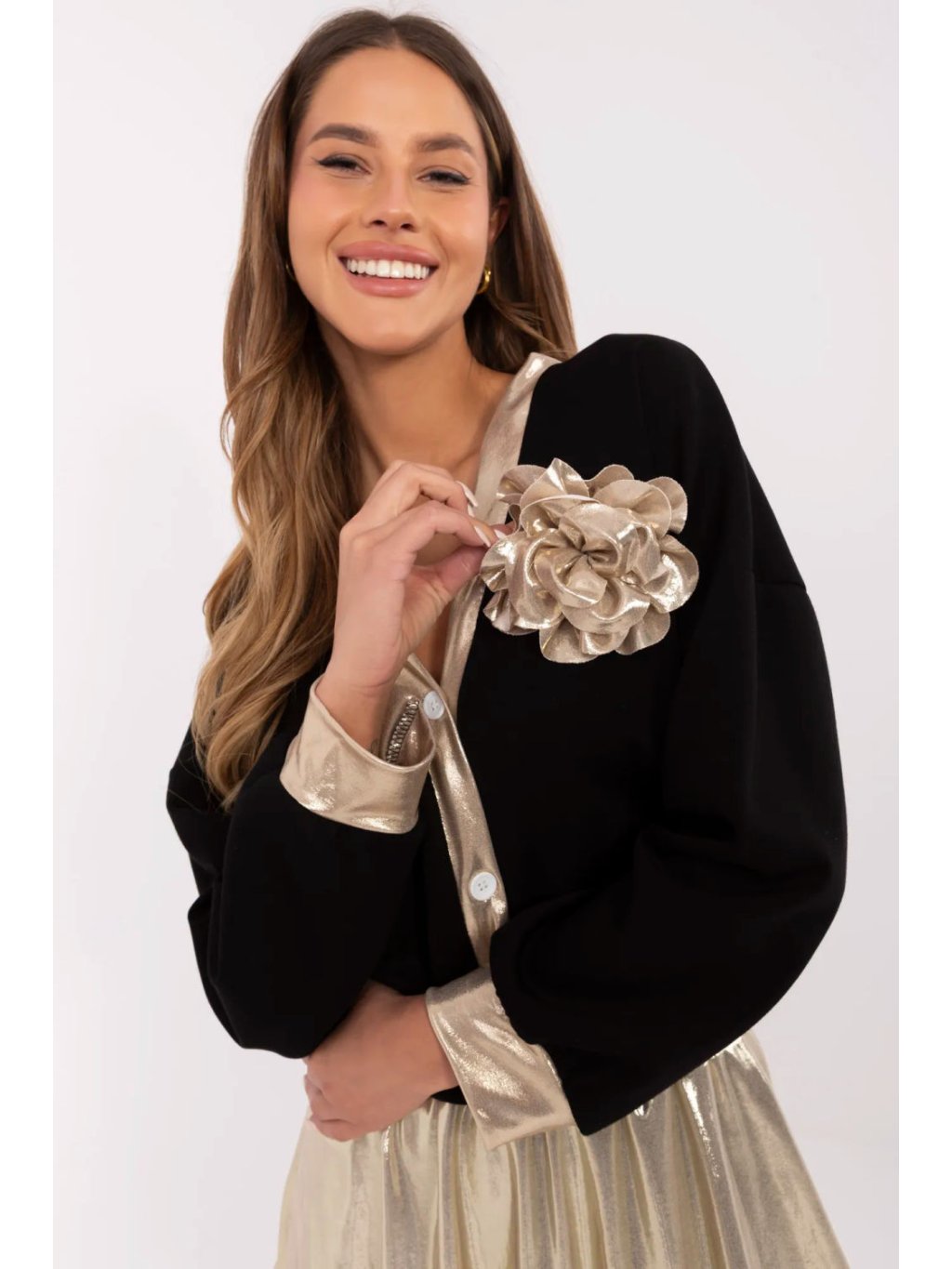 Elegantní dámská blůza, která kombinuje klasický styl s jemnými, efektními detaily. Vyrobená z vysoce kvalitní směsi polyesteru, viskózy a elastanu, poskytuje pohodlí a dokonalé přizpůsobení postavě. Model standardní délky s výstřihem ve tvaru srdce zdůrazňuje krk a dodává ženský charakter. Zapínání na knoflíky a manžety v zlaté barvě dodávají celku luxusní vzhled. Další výhodou je odnímatelná brož ve tvaru květu, která umožňuje personalizaci stylizace. Hladká textura a elegantní střih dělají z blůzy skvělý kousek jak na každý den, tak i na formálnější události.