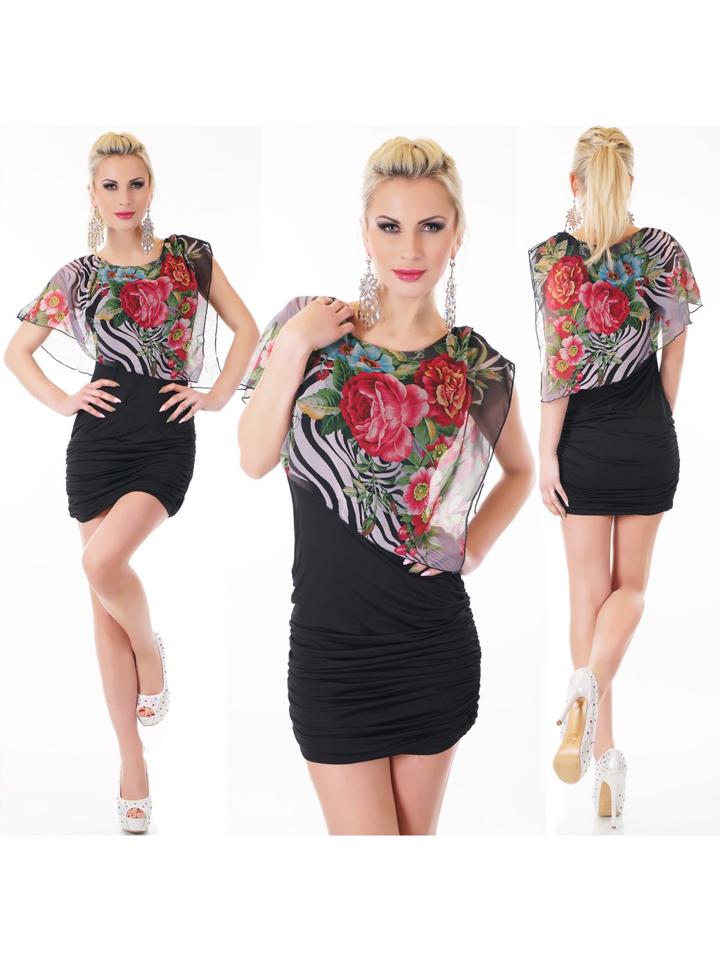 Elegantní dámský minišaty - tunika vhodná i na letní dny. Minišaty jsou ve vrchní části doplněny květovaným šátkem, který je součástí šatů. Šaty jsou v oblasti boků řaseny, pro pěkný vzhled. V šatech jsou na prsou našity vycpávky.