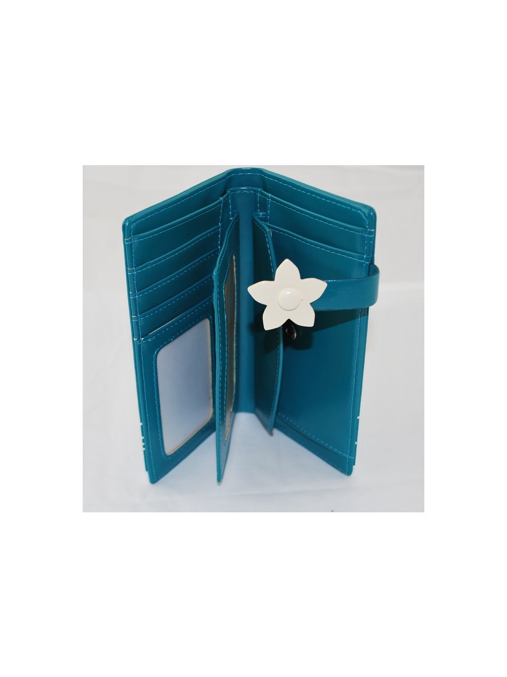 Dětská nebo dámská peněženka ze syntetického materiálu uzavíraná páskem s kytičkou. Uvnitř peněženky pět přihrádek na karty, tři větší kapsičky a jedna velká na bankovky.dostupné barvy (dle obrázku):modrá červená