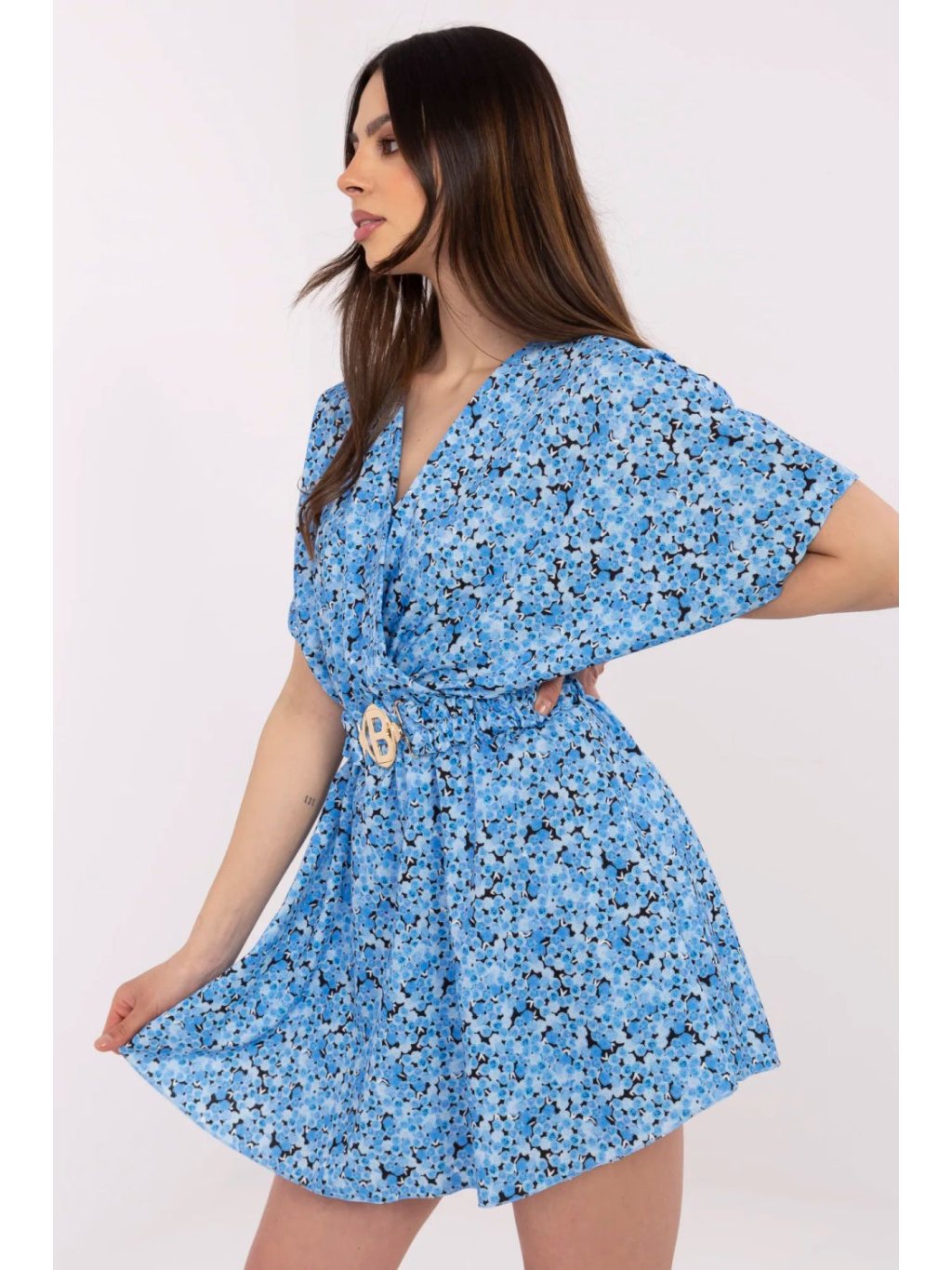 Elegantní kombinéza pro ženy, která spojuje pohodlí s ženským, módním vzhledem. Vyrobená z směsi viskózy, elastanu a polyesteru, materiál je lehký, příjemný na dotek a ideální na teplejší dny. Květinový vzor dodává celku svěžest a romantický charakter, díky čemuž se kombinéza vyznačuje mezi ostatními. Model s mini délkou a krátkým rukávem s přeloženým výstřihem, který krásně zdůrazňuje krk a ramena. Na vrchu kombinézy je sukně, která dodává lehkost a dívčí šarm. Bez zapínání je velmi pohodlná, a díky zapínacímu pásku v pase se dá přizpůsobit siluetě. Ideální na každodenní stylizace, spojující pohodlí s elegantním, ženským akcentem.