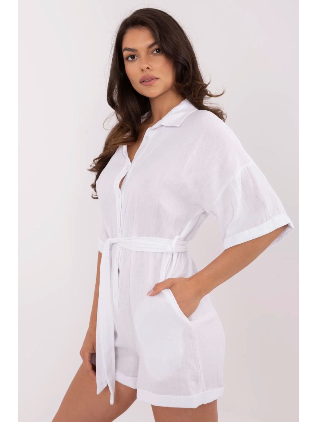 Lehký, mušelínový kombinéza z bavlny je ideální volbou pro každodenní outfity v teplejších dnech. Hladká struktura materiálu a přirozená prodyšnost bavlny zaručují pohodlí po celý den. Model s krátkým rukávem a klasickým límečkem spojuje volnost a styl. Zapíná se předními knoflíky, co usnadňuje oblékání a dodává elegantní dokončení. Kombinéza je vybavena textilním páskem k zavázání, který zdůrazňuje pas a dodává postavě ženský tvar. Vsuvné kapsy po stranách zvyšují jeho funkčnost a pohodlí. Jedná se o praktickou a stylovou volbu na léto, skvělou jak na procházky, nákupy, tak i volné setkání s přáteli.