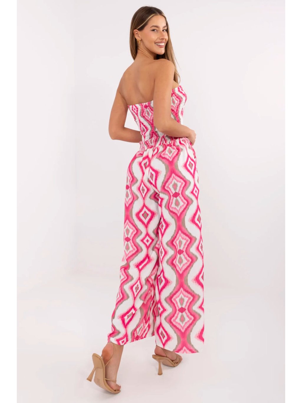 Stylový a pohodlný kombinéza s geometrickým vzorem je ideální volbou na každý den. Vyrobený z lehké, prodyšné viskózy, skvěle se hodí na teplejší dny, poskytující pohodlí a volnost pohybu. Moderní design spojuje ženský styl s městskou pohodou. Model bez rukávů s obdélníkovým výstřihem a jemnými záhyby v horní části, které přidávají objem a jemný šarm. Vložené vycpávky zajišťují dobré držení prsou a umožňují nošení kombinézy bez podprsenky. Bez zapínání usnadňuje oblékání, stačí ho přetáhnout přes hlavu. Dlouhé, široké nohavice se krásně skládají a opticky prodlužují postavu, a praktické, vsunuté kapsy přidávají funkčnost. Je to skvělá volba na každodenní vycházky, procházky nebo schůzky, kdy chcete vypadat módně a zároveň se cítit volně.