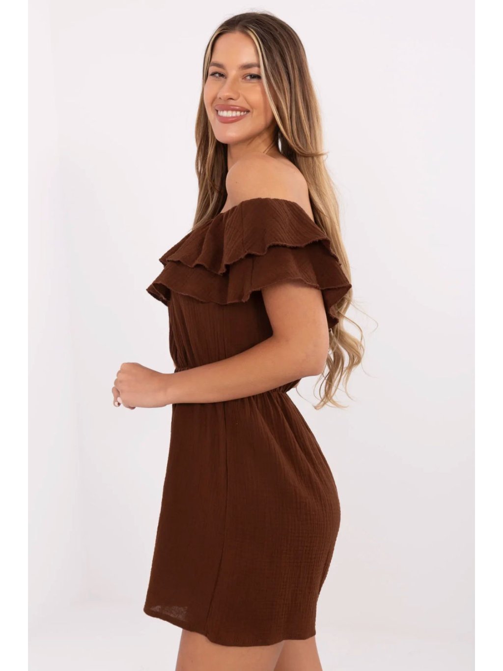Lehký a prodyšný mušlinový overal je ideální volbou pro letní každodenní outfit. Vyrobený z přírodní bavlny, zaručuje pohodlí a pohodlí i v horkých dnech. Krátký střih bez rukávů krásně zdůrazňuje nohy a ramena, a španělský výstřih s ozdobným volánem dodává ženské kouzlo a letní uvolnění. V pasu je elastický pásek, který jemně zdůrazňuje pas a zajistí ideální přizpůsobení postavě. Model nemá zapínání, což ho činí mimořádně pohodlným a snadným na nasazení. Hladký materiál v kombinaci s jednoduchým střihem ho činí universální volbou pro každý den, skvěle se hodí na procházku, pláž nebo během dovolené.