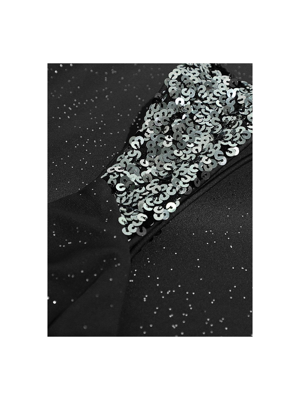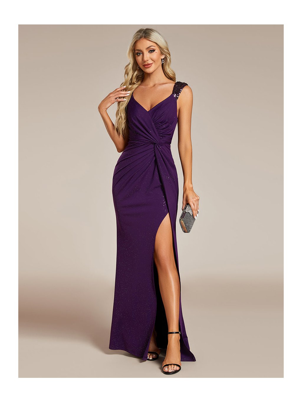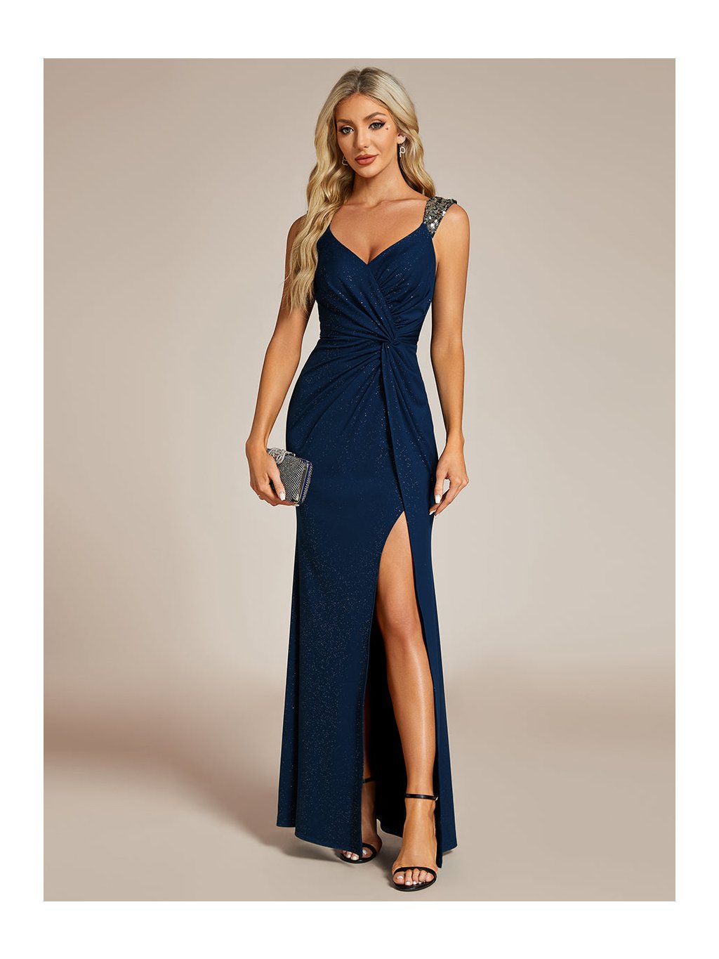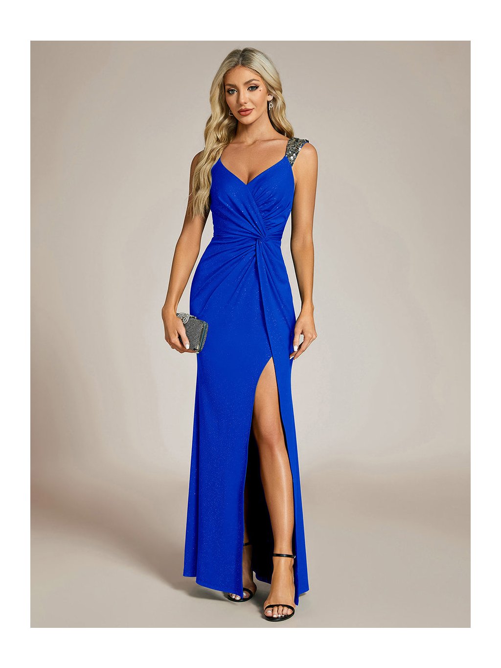 Krásné dlouhé šaty, na široká ramínka. V pase překřížení. Šaty mají krásný véčkový výstřih na prsou. Šaty nemají vycpávky ani podšívku. Na zádech je skrytý zip. Šatičky krásně padnou, jsou z velmi příjemného materiálu. A mají lehký nadech třpytek na ramenu ozdoba z našitých flitrů.