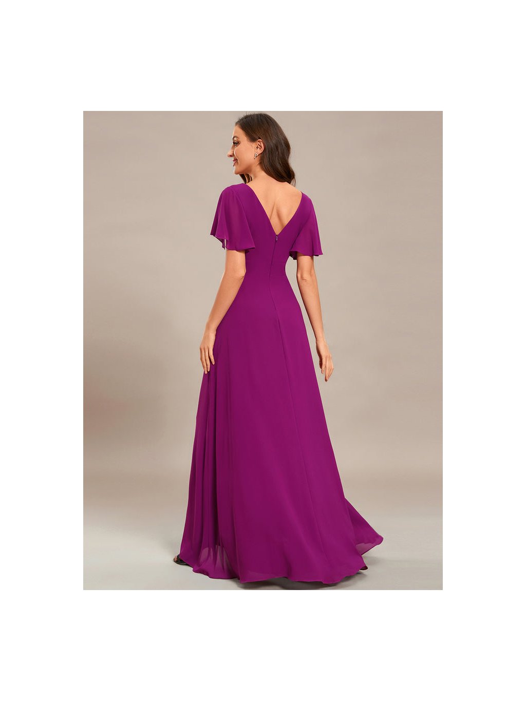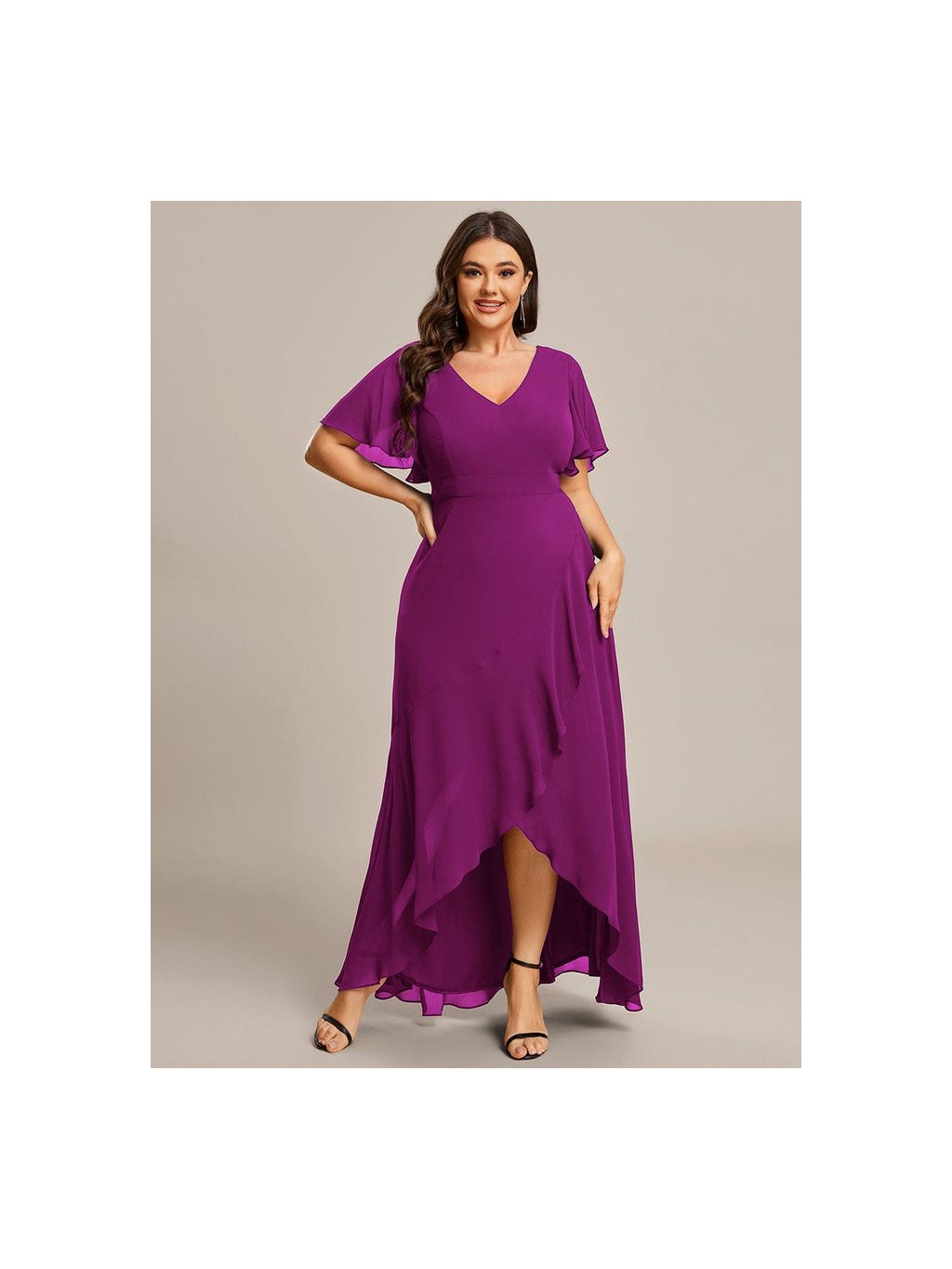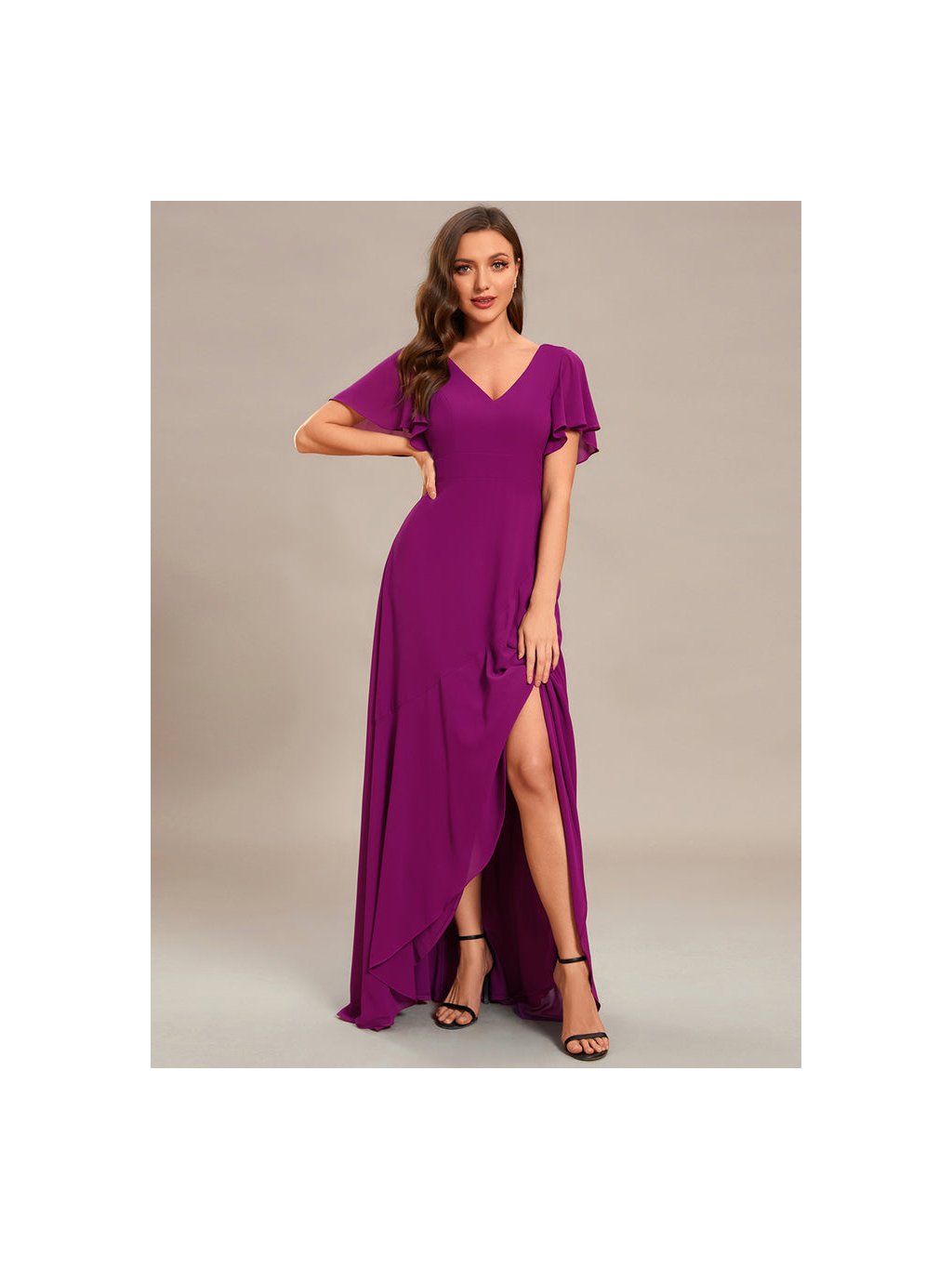 Jemné šifonové šaty s krátkými rukávy, dokonalý jednoduchý design. Šaty mají midi délku a asymetrickou sukni, ideální pro svatební hosty či družičky.