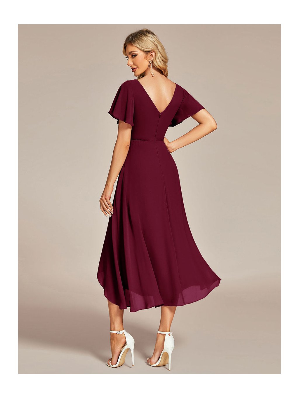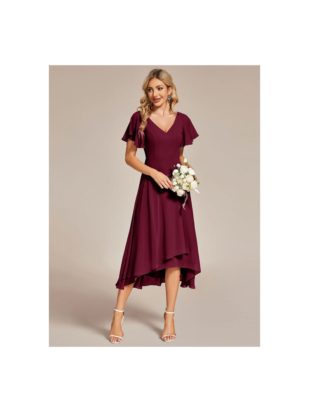 Jemné šifonové šaty s krátkými rukávy, dokonalý jednoduchý design. Šaty mají midi délku a asymetrickou sukni, ideální pro svatební hosty či družičky.
