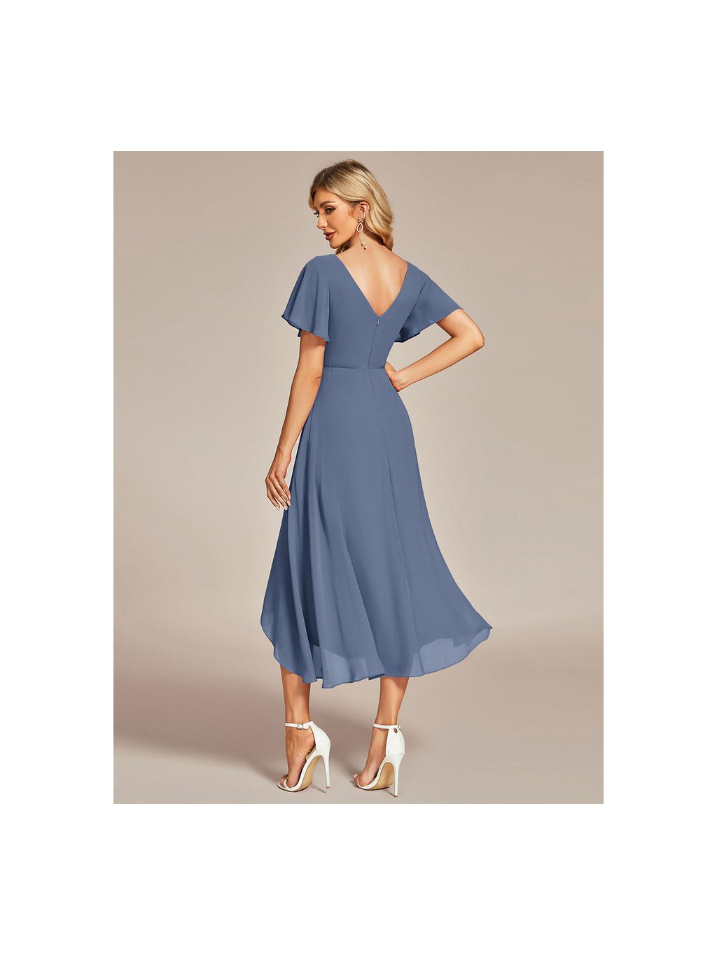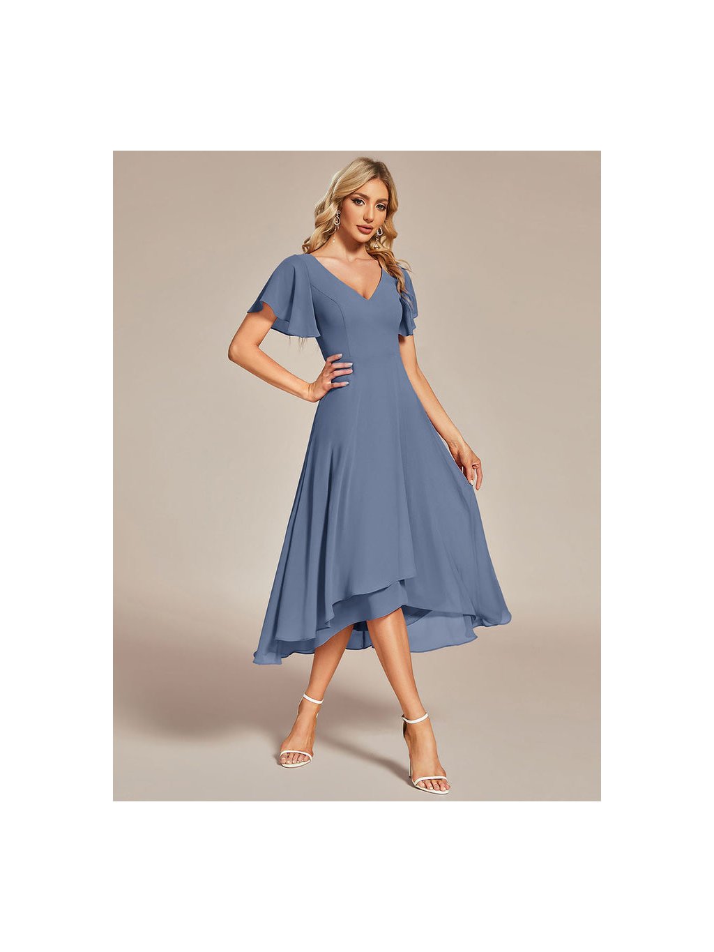 Jemné šifonové šaty s krátkými rukávy, dokonalý jednoduchý design. Šaty mají midi délku a asymetrickou sukni, ideální pro svatební hosty či družičky.