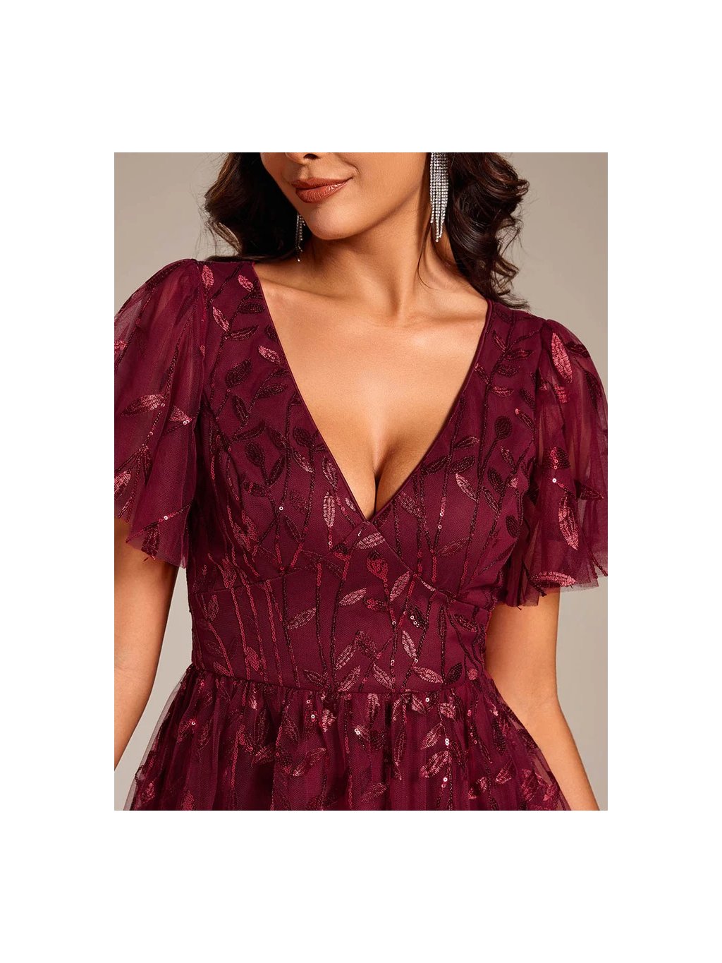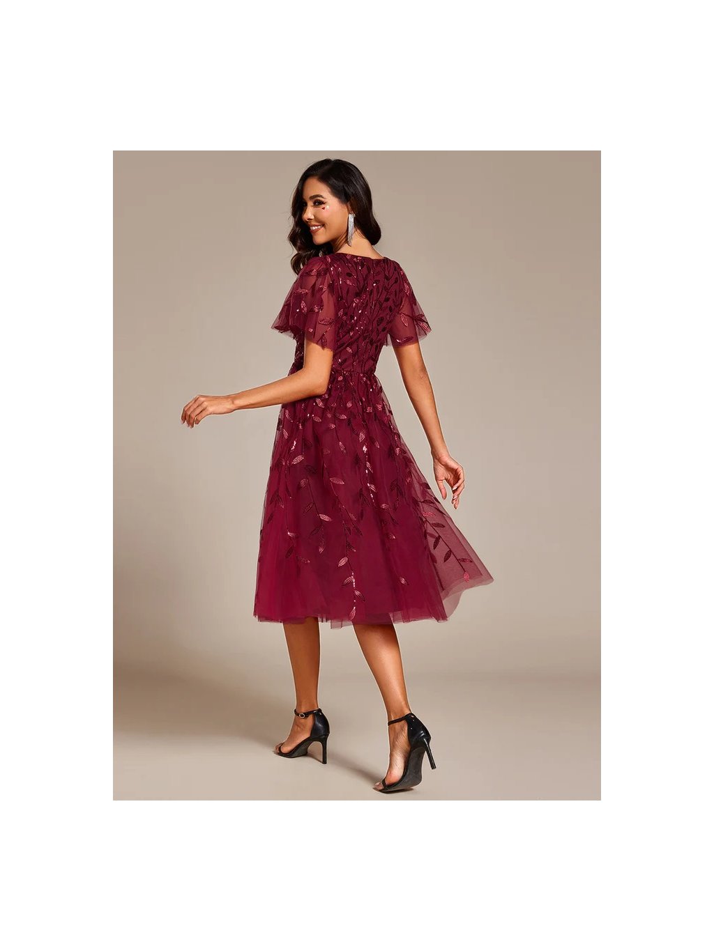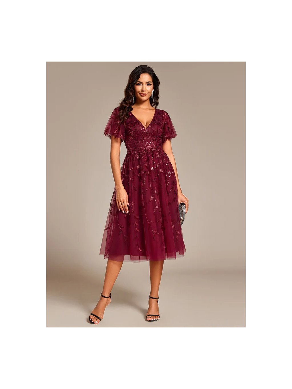 Jemné šifonové šaty s volánovým rukávem,výstřihem do V dokonalý jednoduchý design. Šaty mají midi délku a asymetrickou sukni, celé jsou vyšívané s jemným odleskem.