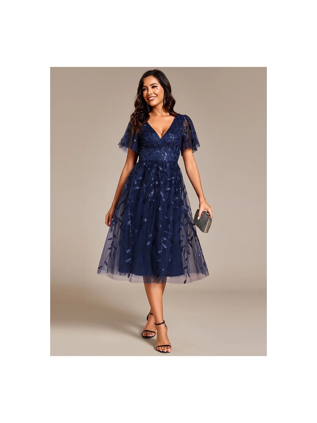 Jemné šifonové šaty s volánovým rukávem,výstřihem do V dokonalý jednoduchý design. Šaty mají midi délku a asymetrickou sukni, celé jsou vyšívané s jemným odleskem.