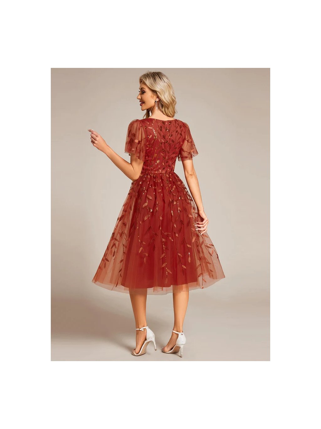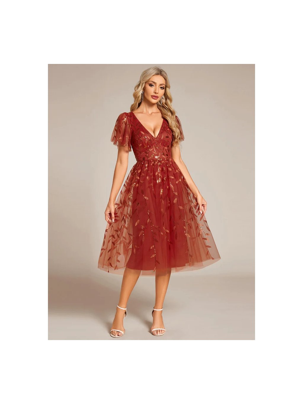 Jemné šifonové šaty s volánovým rukávem,výstřihem do V dokonalý jednoduchý design. Šaty mají midi délku a asymetrickou sukni, celé jsou vyšívané s jemným odleskem.