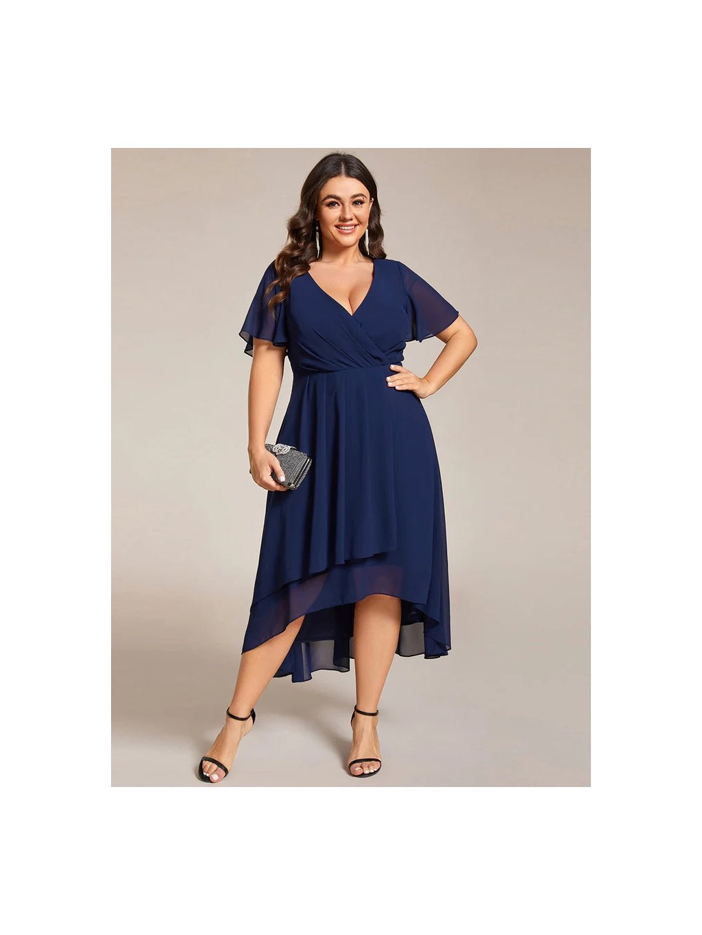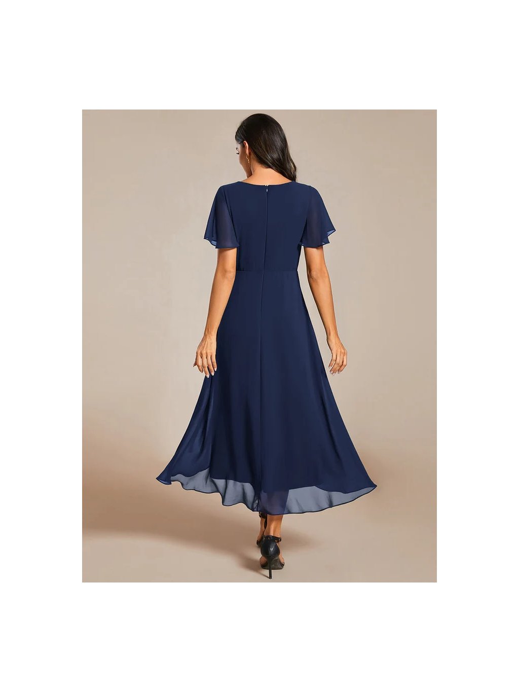 Jemné šifonové šaty s volánovým rukávem,výstřihem do V dokonalý jednoduchý design. Šaty mají midi délku a asymetrickou sukni, vhodné pro večírek i na svatbu