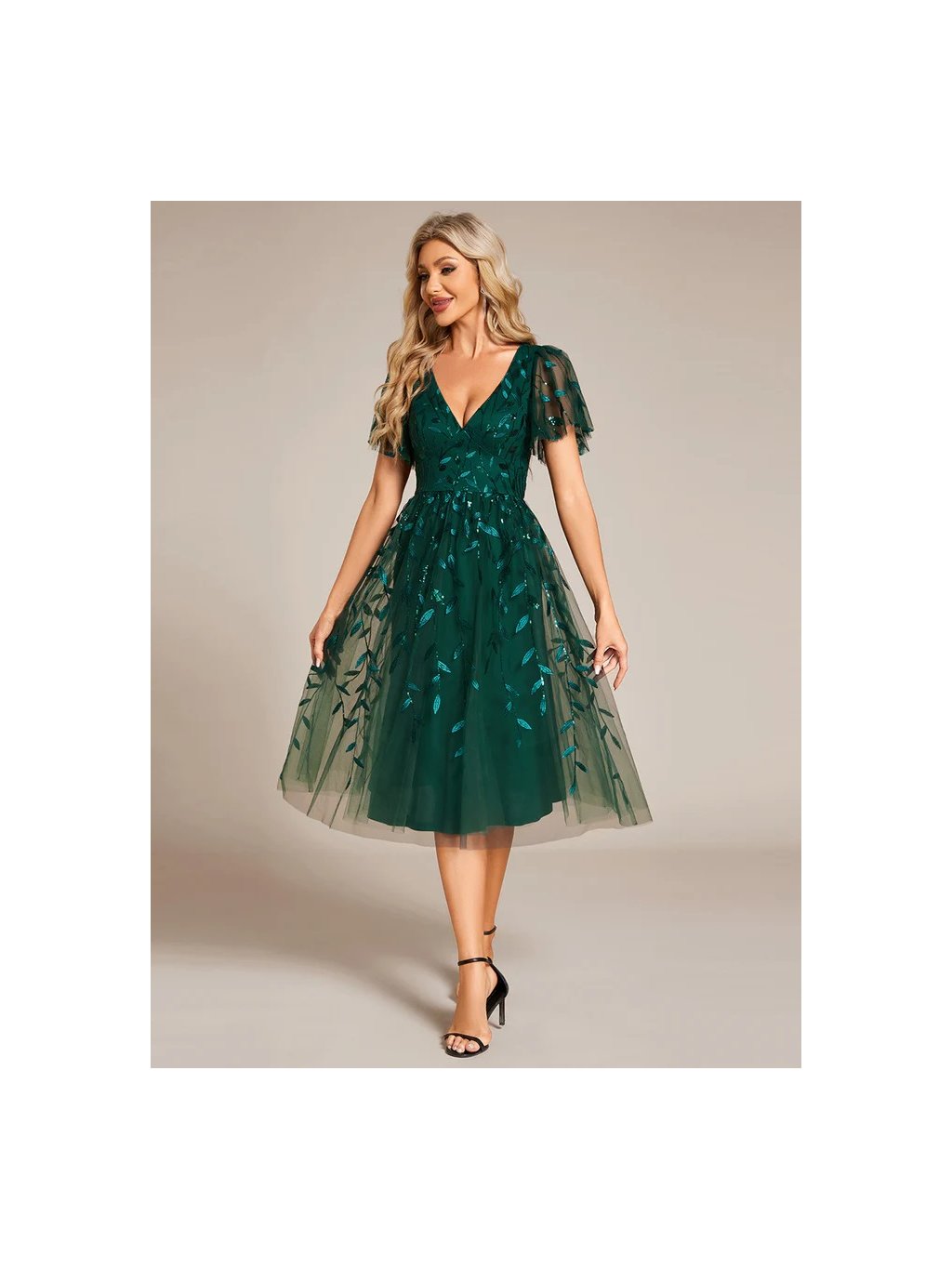 Jemné šifonové šaty s volánovým rukávem,výstřihem do V dokonalý jednoduchý design. Šaty mají midi délku a asymetrickou sukni, celé jsou vyšívané s jemným odleskem.