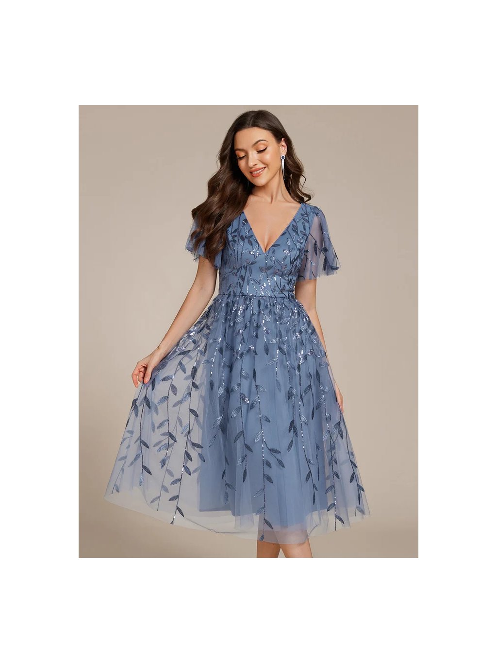 Jemné šifonové šaty s volánovým rukávem,výstřihem do V dokonalý jednoduchý design. Šaty mají midi délku a asymetrickou sukni, celé jsou vyšívané s jemným odleskem.